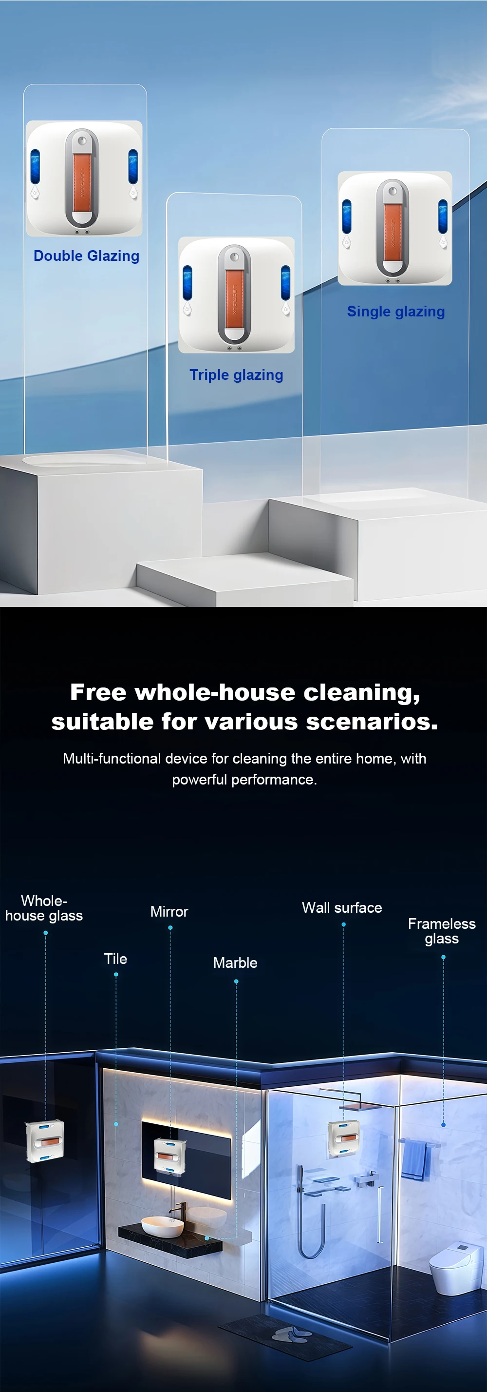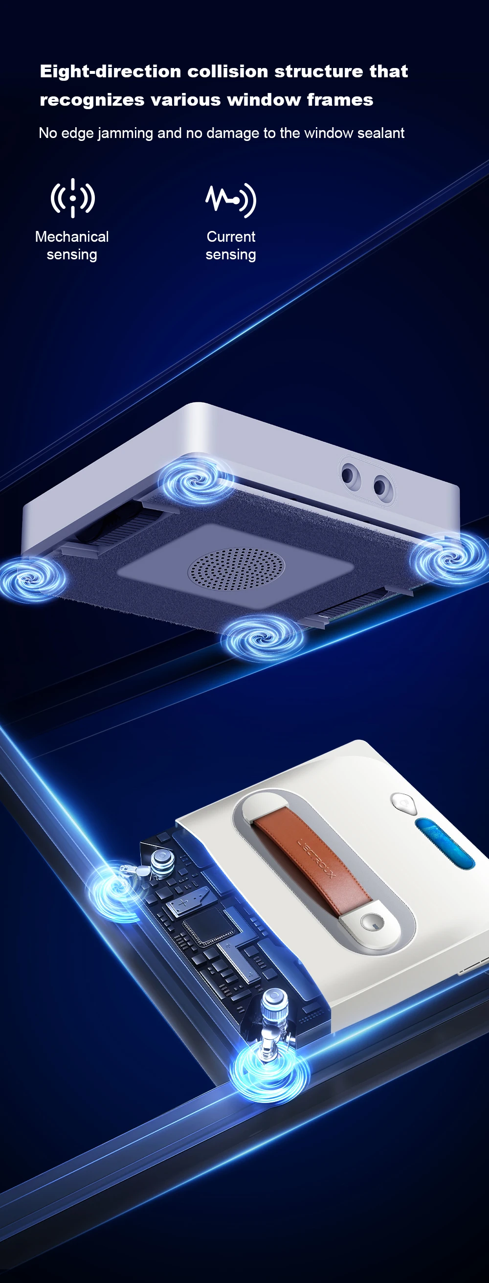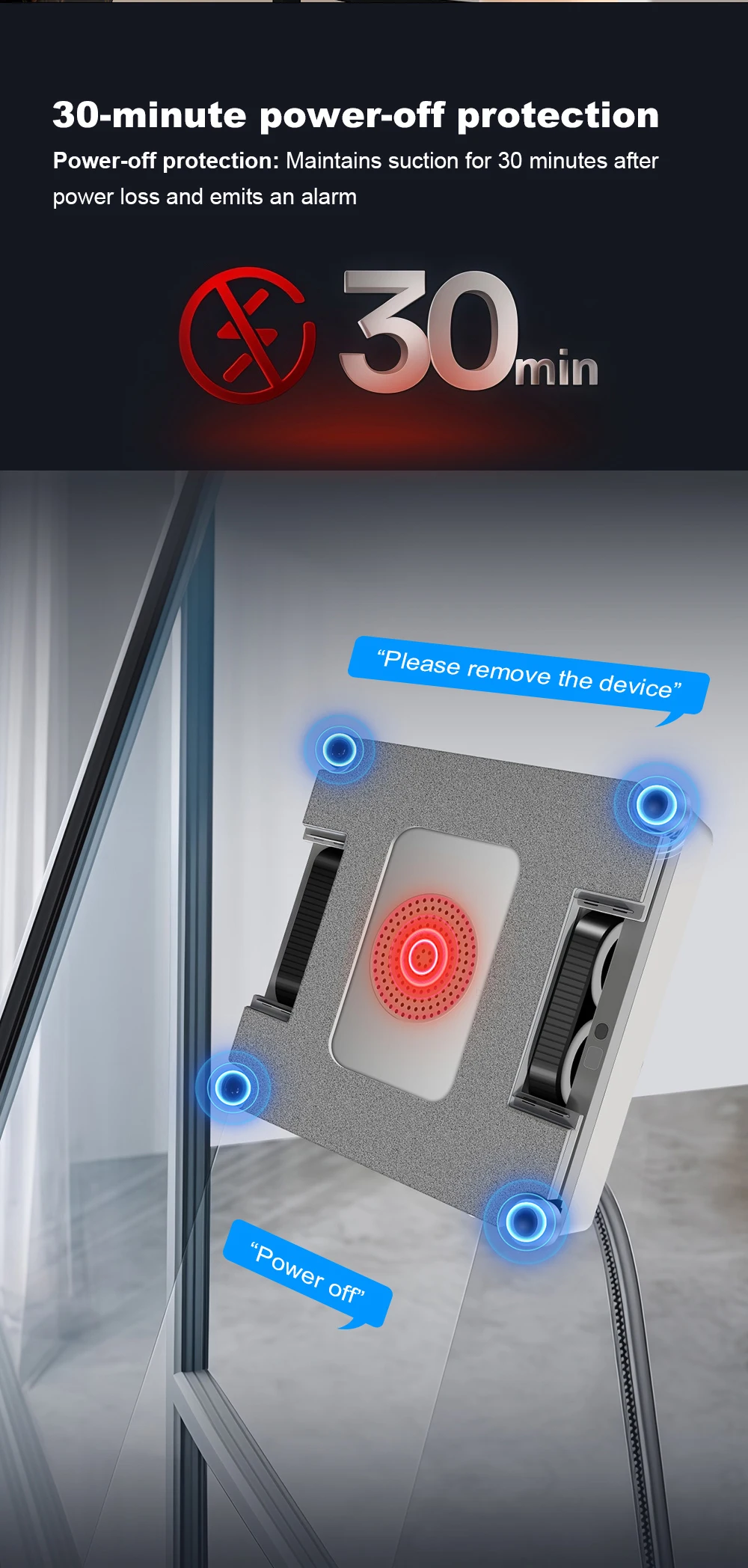 7. Built-in battery as the backup power, the robot can adhere to the glass about 30mins even if the electric is suddenly cut off;