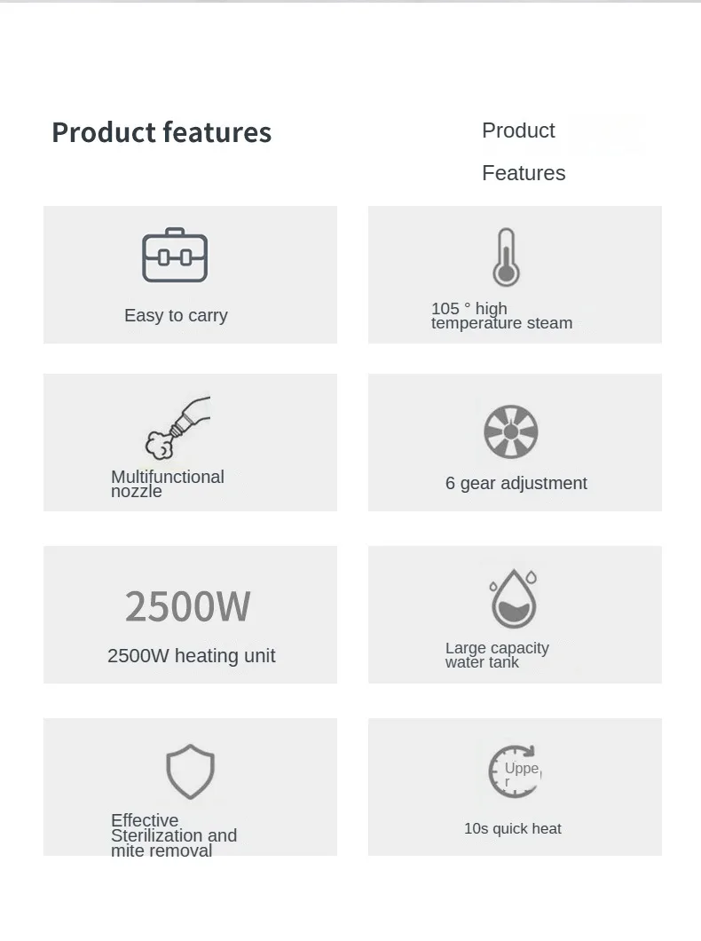 3. Lengthen power cord and steam hose, one-person operation is not labious, can meet cleaning needs.