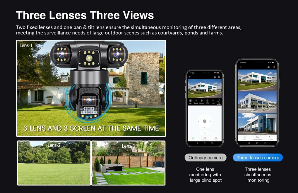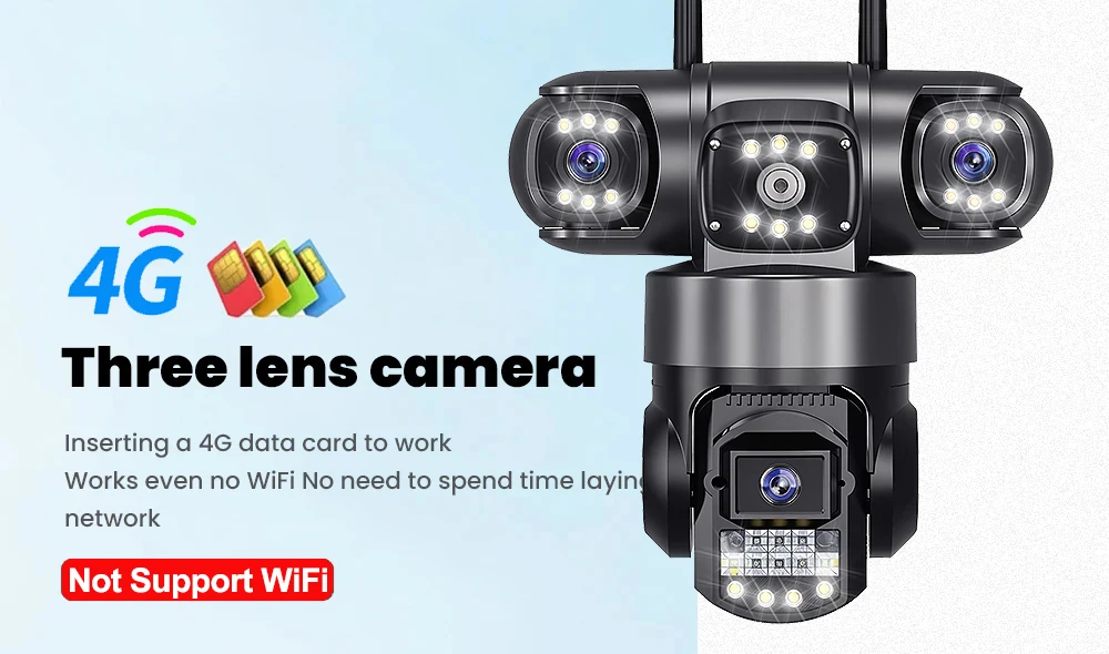 4G Camera With Sim Card 12MP 6K Three Lens Three Screen Monitor Night Vision Security Protection V380 Pro PTZ Video Surveillance