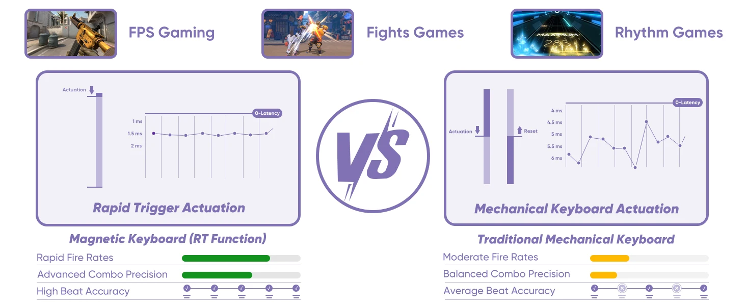 RT0.005mm Achieve ultra-accurate 0.005mm Rapid Trigger and adjustable actuation distance in 0.005mm step. This allows users to fine-tune their typing or gaming experience, ensuring optimal actuation for faster response times with enhanced precision, ideal for competitive gaming. |