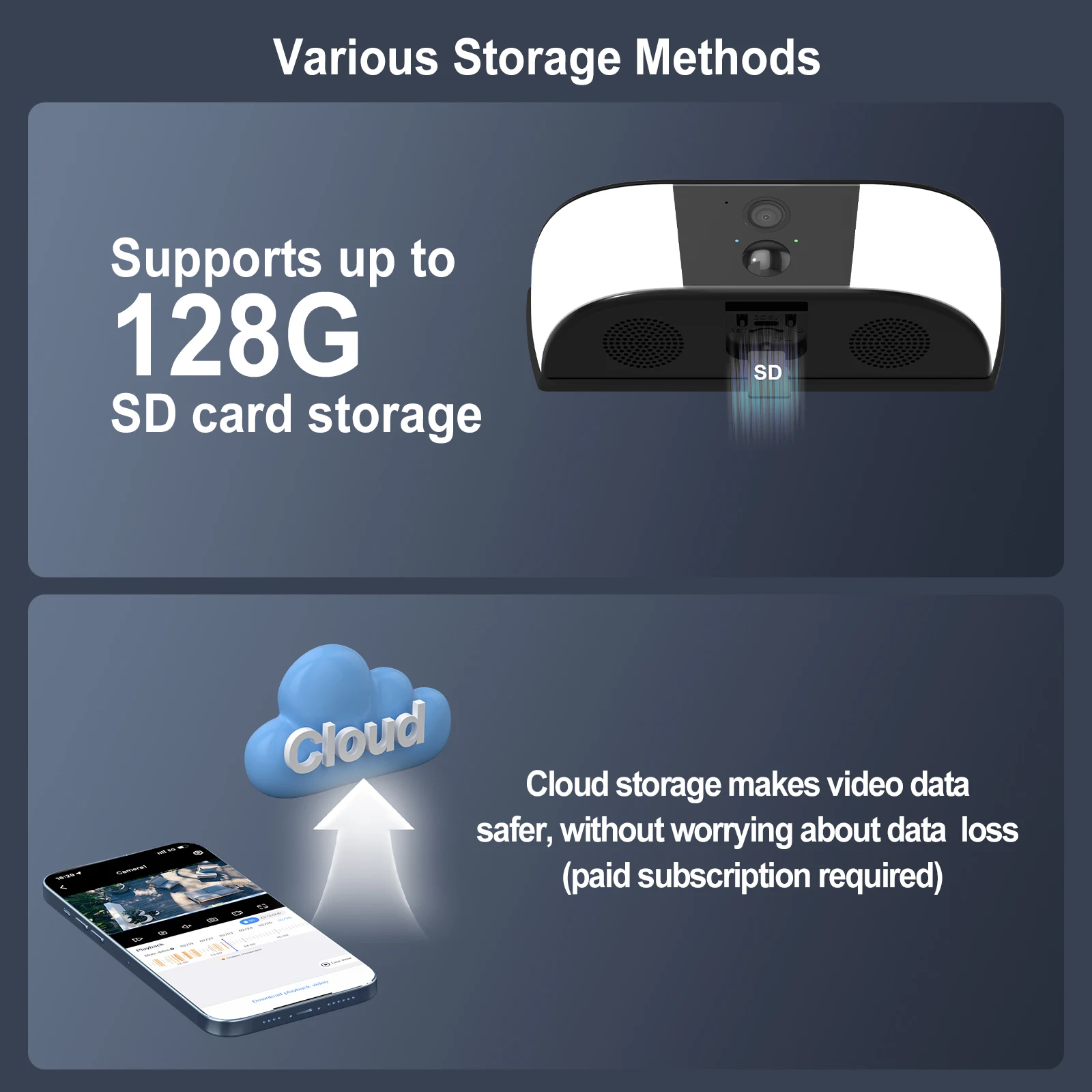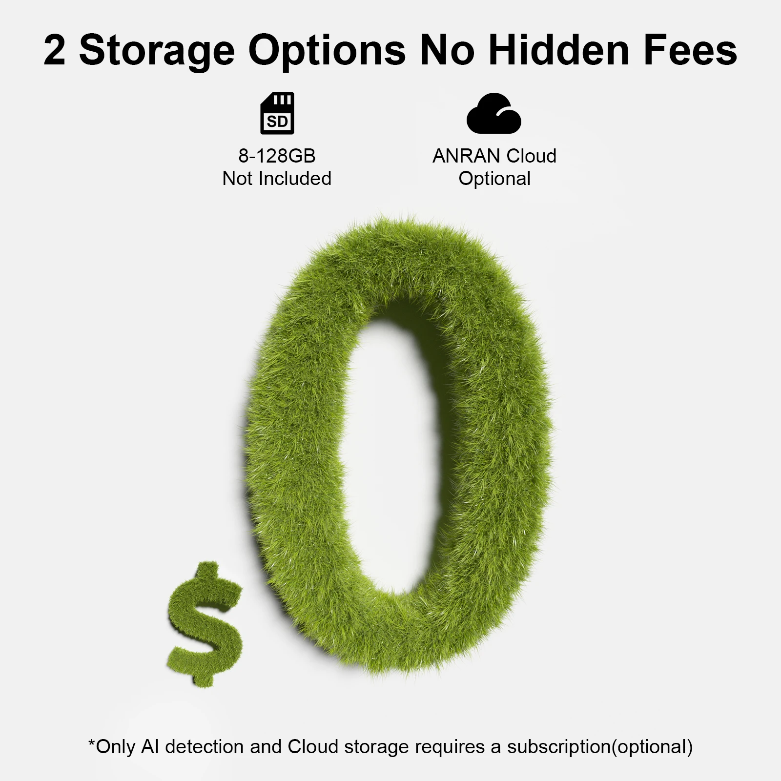 The camera offer permanently free 7-day cloud storage services, each recording lasts for 6 seconds. If you need storage longer recording, you can purchase storage space in the ANRAN APP according to your needs. And it also support SD card storage mode, you can inset 8-128GB memory card(not include).
