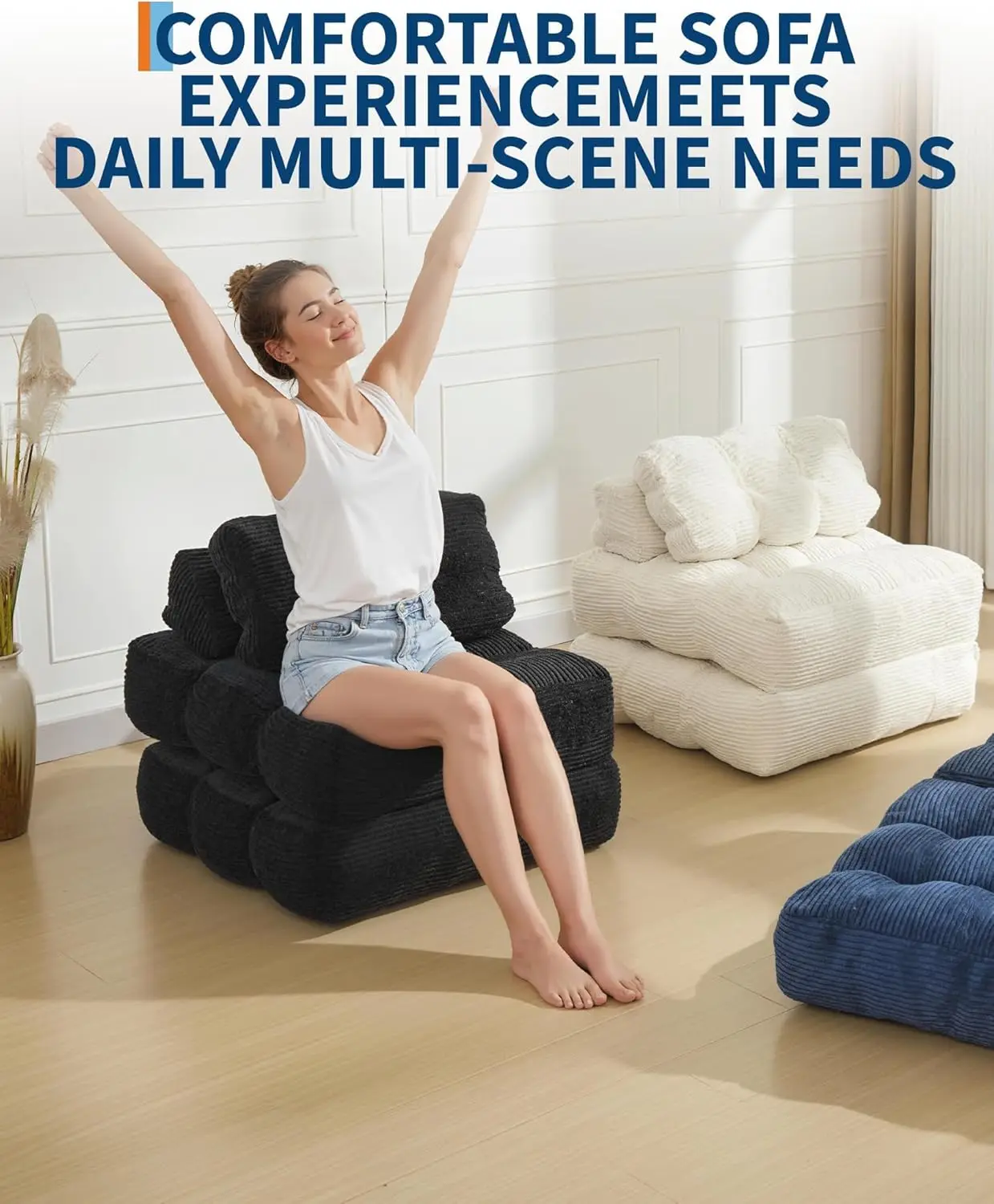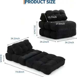 Enhanced Support System: This 3-in-1 convertible sofa bed has adjustable headrest featuring secure strap and buckle attachment, ensuring steadfast positioning on the sofa frame without slipping or movement. This sofa bed also has ergonomic lumbar pillow which specifically contours to support your lower back’s natural alignment, effectively reducing strain during prolonged sitting sessions. Together, they deliver premium relaxation whether seated or reclined.