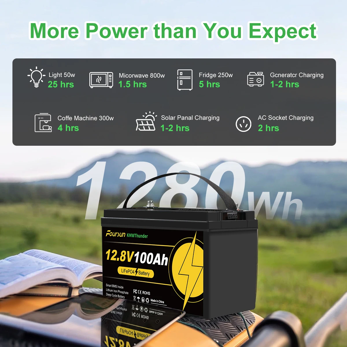 Wide Application The LiFePO4 battery is suitable for many off-grid applications, perfect for RVs, boats, golf carts, solar/wind energy storage systems, UPS backup, outdoor camping, home power supply and more.