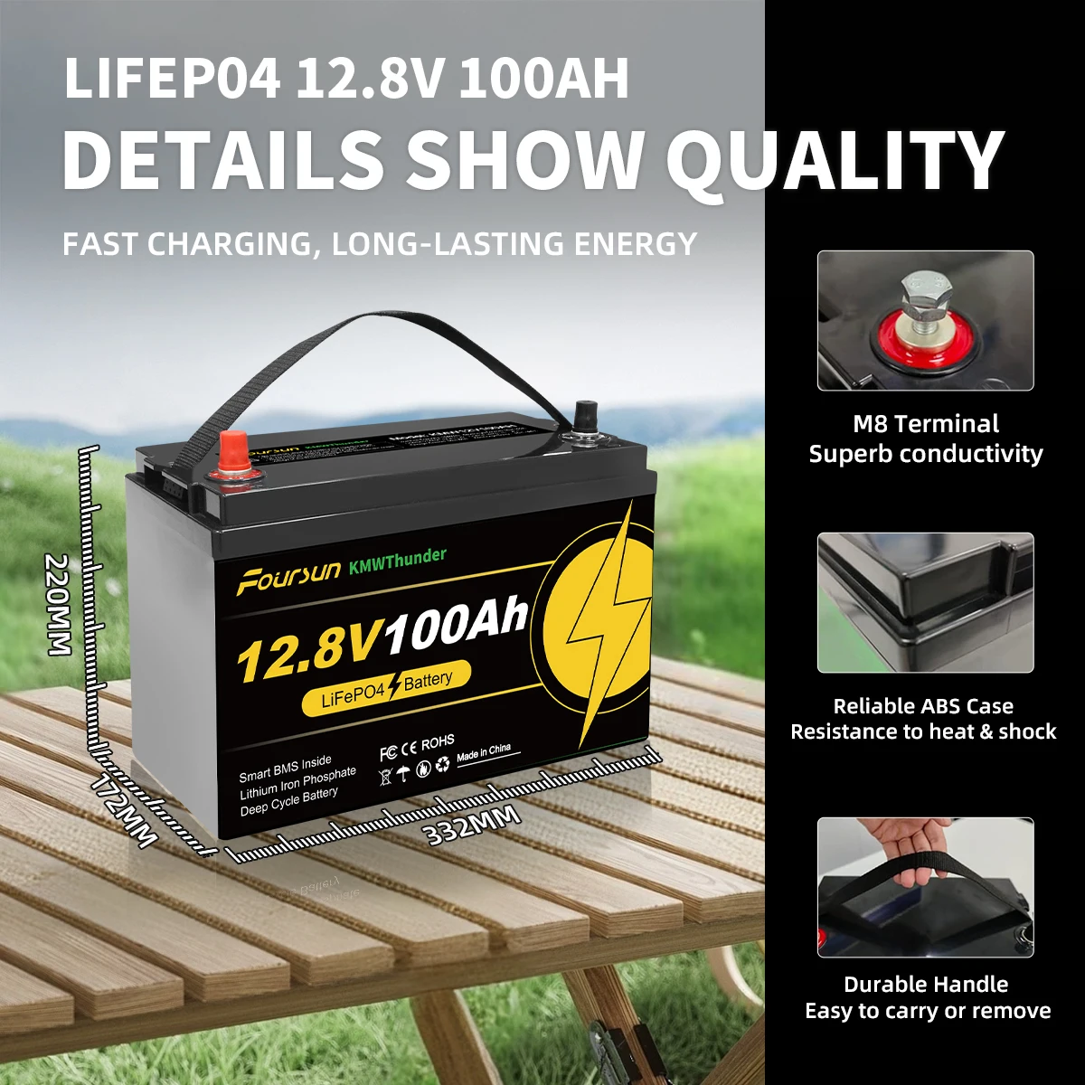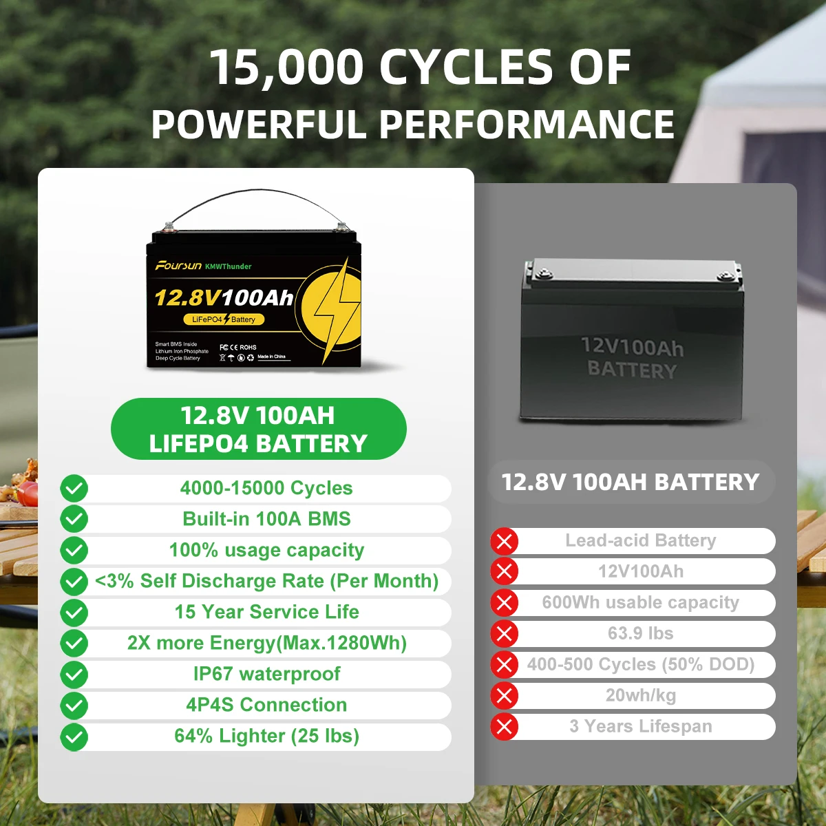 Replace traditional lead-acid batteries: our 12V 100Ah Deep Cycle 4500+ LiFePO4 battery, longer life; It weighs only 1/3 the weight of lead-acid batteries of the same capacity; LiFePO4 batteries can be discharged 100% while lead acid batteries are only discharged to 40-50%