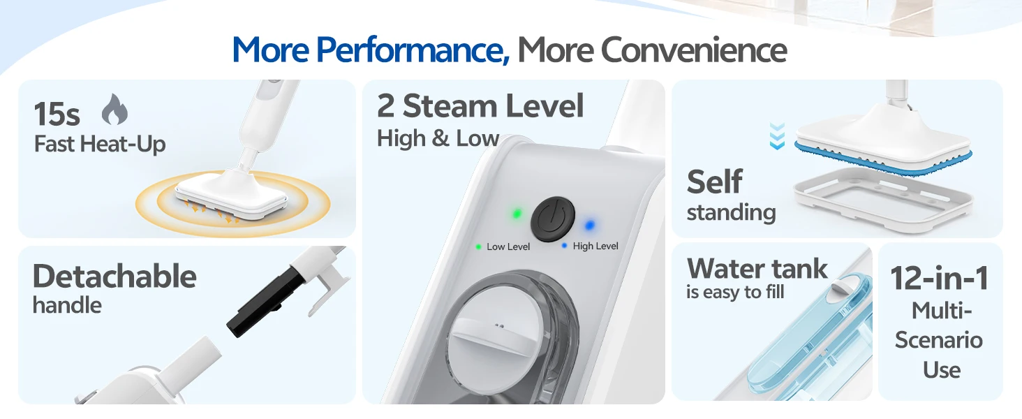 Instant Steam in 15 Seconds & Dual Steam Modes-Low (22g/min) for daily shine, high (30g/min) for deep cleaning – adjustable via the ergonomic handle for precise control.