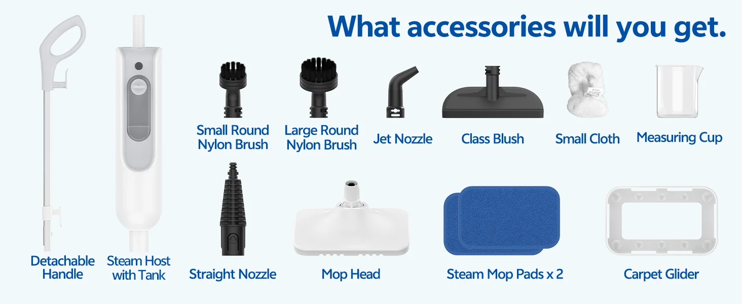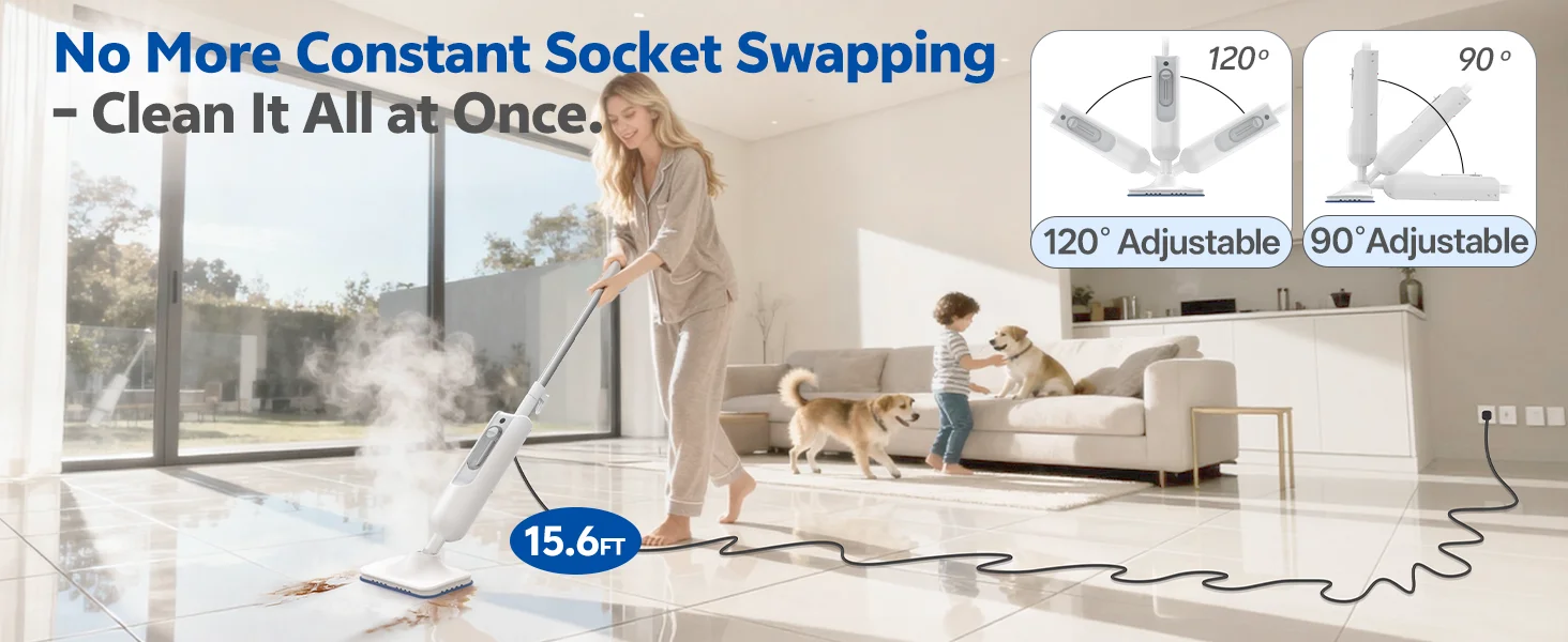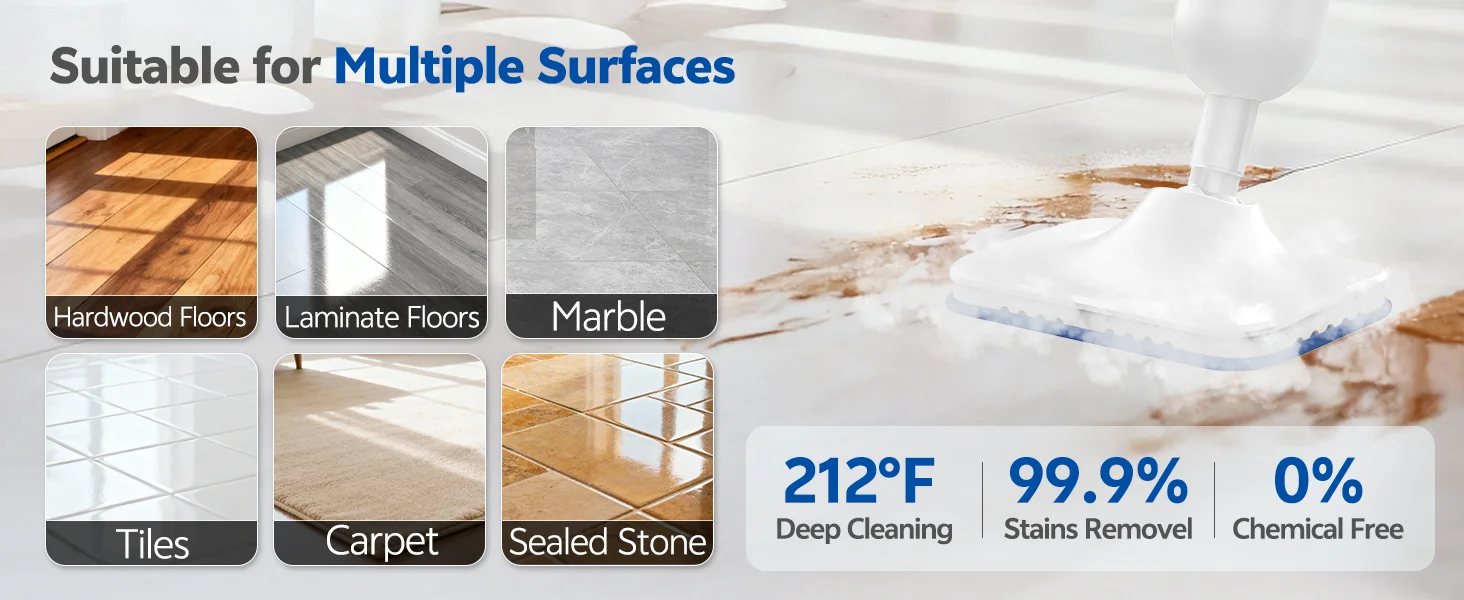 Powerful Steam-The steam cleaner is a perfect solution for natural deep cleaning, thorough cleaning up to 99.99% of viruses and bacteria, keep your floors clean without chemical residue and also remove odors. fast floor drying without damage, efficient cleaning between different floor types or other use.