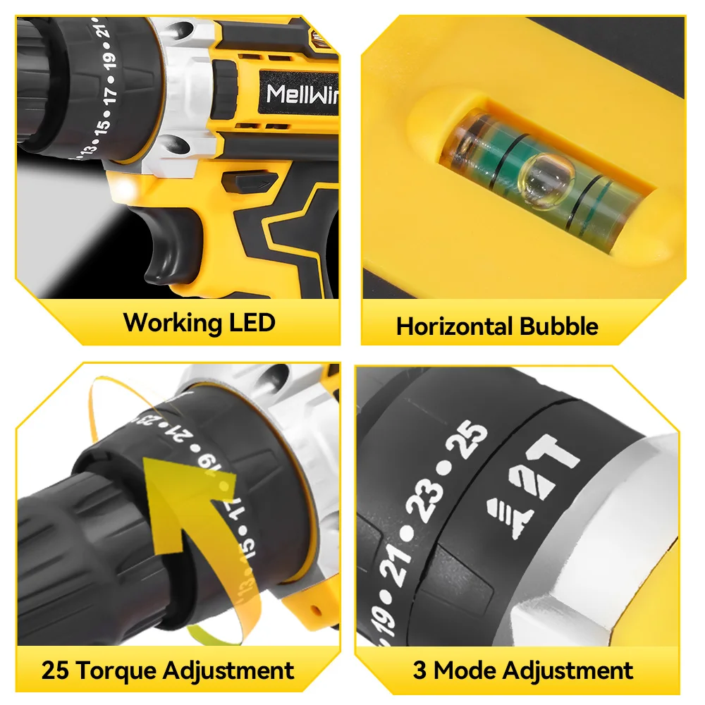 【Drill Bit Slot Design】: The body of the drill comes with two slots for storing bits, which allows users to easily and quickly change different bits during the use of the drill to improve work efficiency. At the same time, this also prevents the loss of bits and makes it easier for the user to manage and store them.