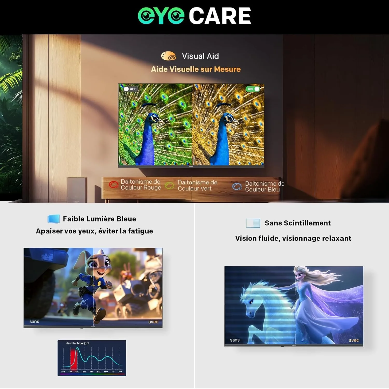 [Eye Care – Take Care of Your Eyes, Clarity for All] Metz TV, a bespoke visual aid corrects color vision disorders, while low blue light and flicker-free technology reduces eye strain, ensuring a vivid, safe and comfortable viewing experience for all.