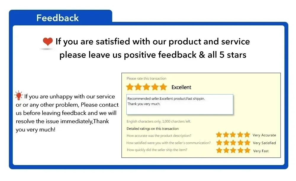 If you are satisfied with our product and service, please leave us peositive feedback & all 5 stars.