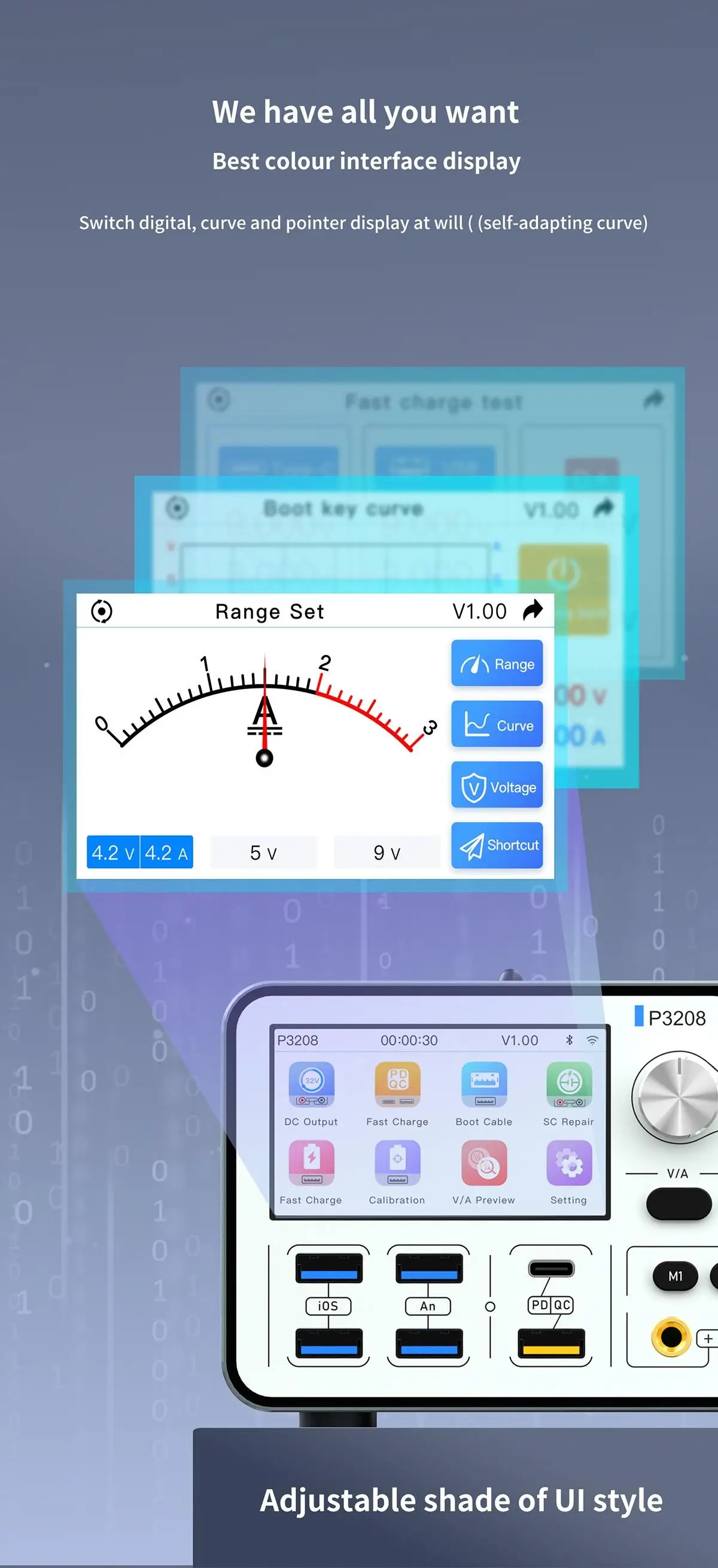 3.0-inch IPS full-view high-definition display, current acquisition accuracy 0.1mA, support curve or pointer display.