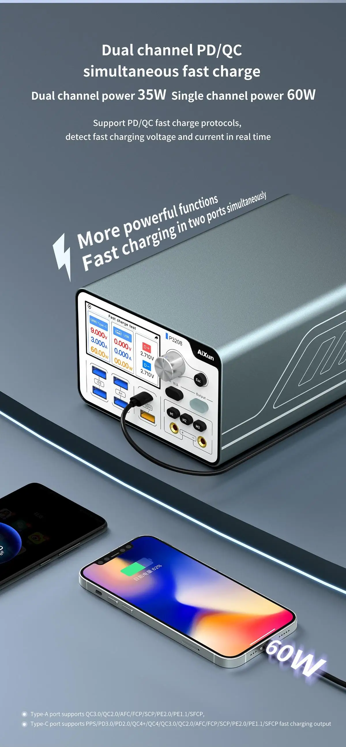 The maximum charging power of single channel is 60W, and the maximum charging power of dual channel is 30W;