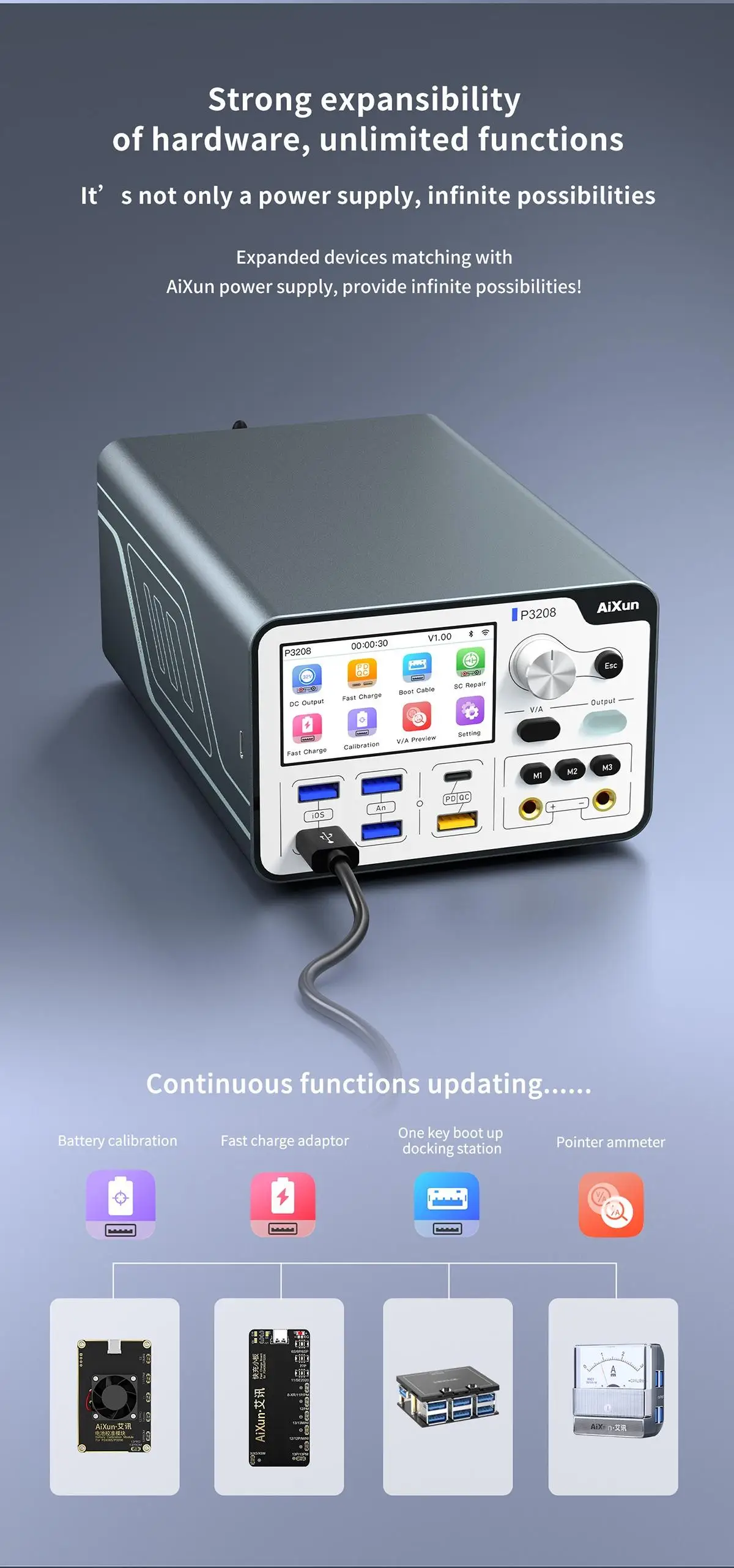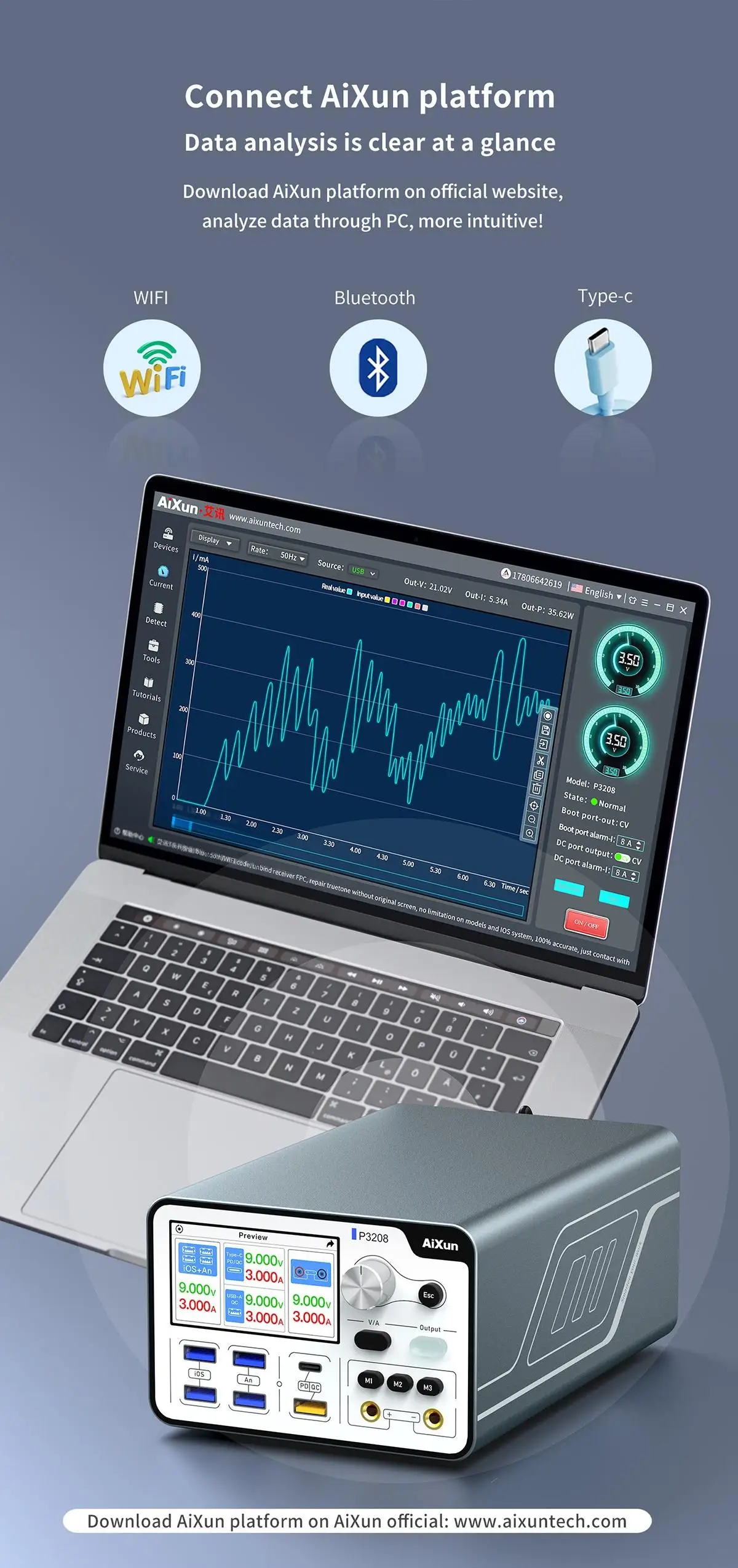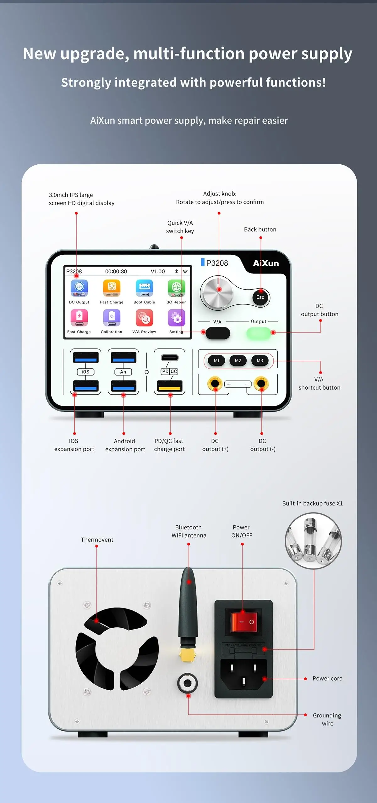 Aixun P3208 320W Power Supply One-button Power-on Test Phone motherboard for iPhone 6-14 Pro Max Repair Tool. AIXUN P3208 regulated power supply is a 320W high-power intelligent and convenient power supply with an output voltage and current of 32V/8A.