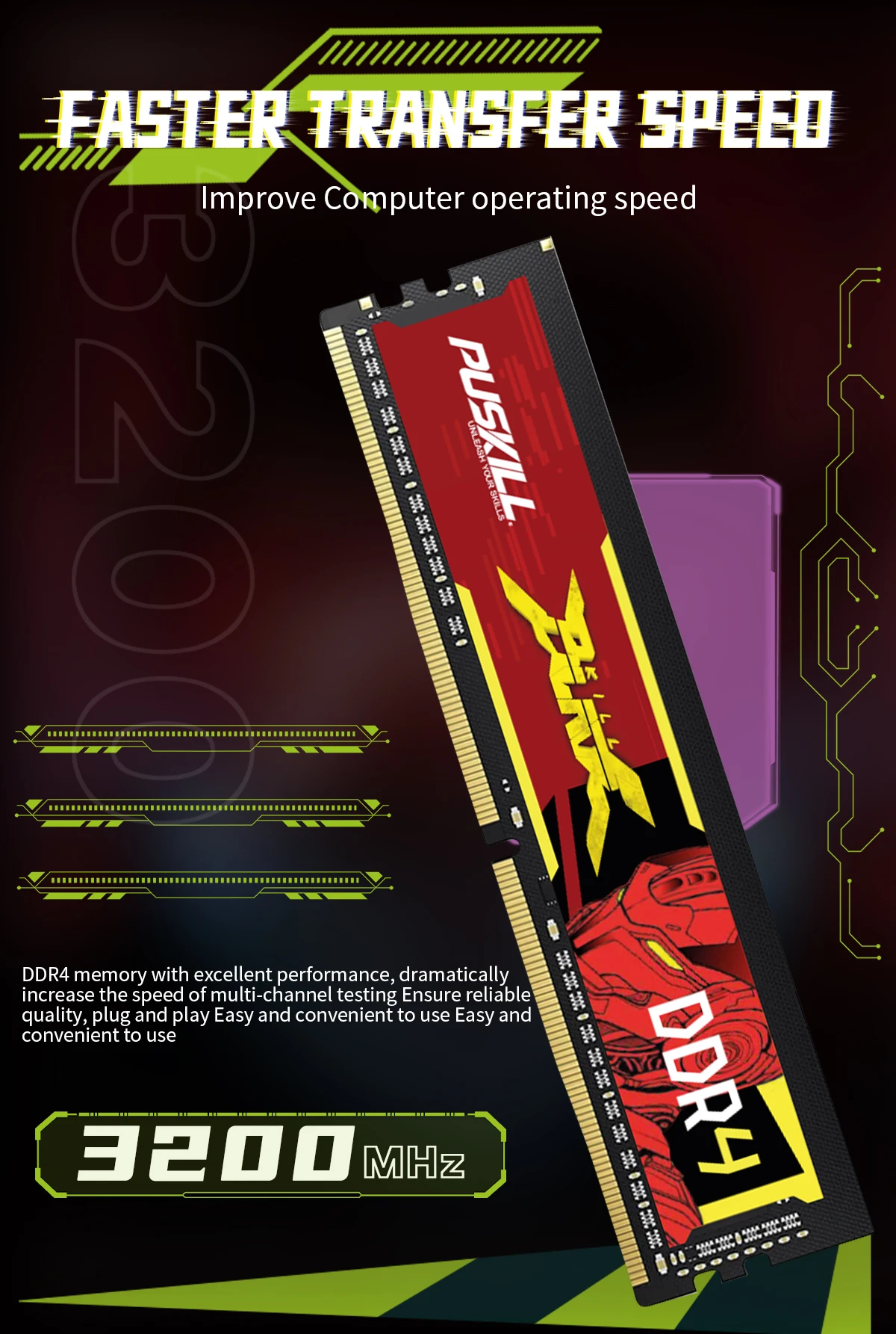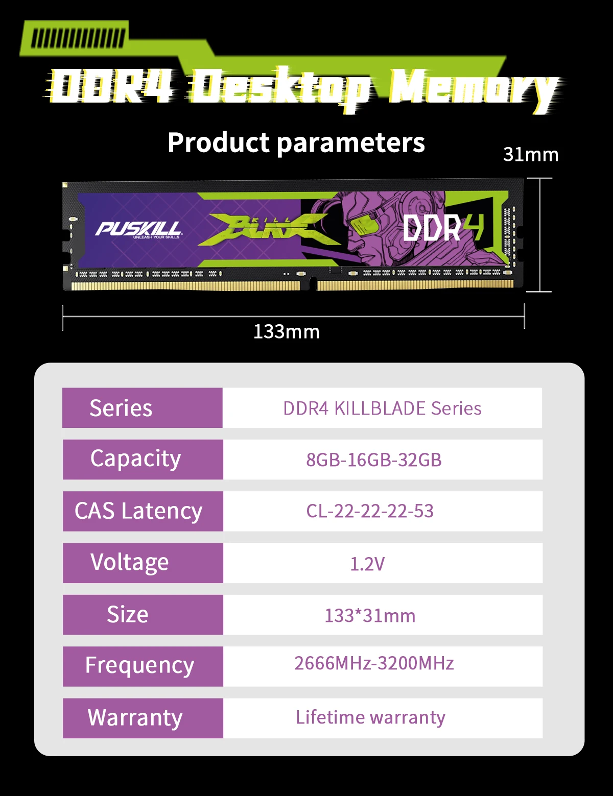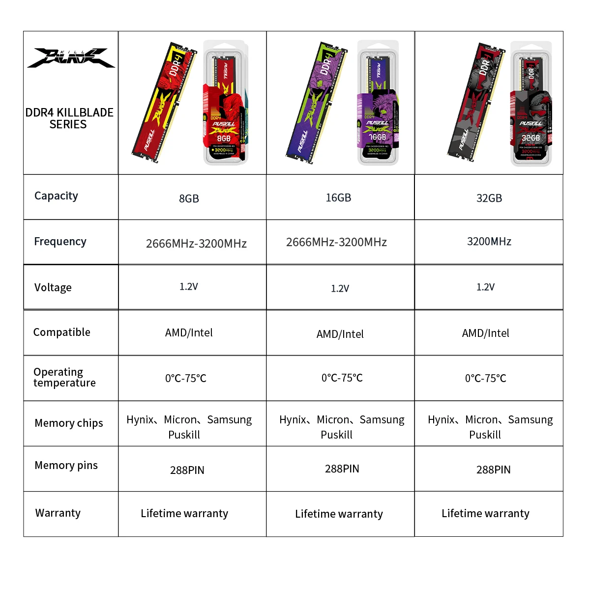 • Product: Puskill Killblade Desktop Memory 16/8gb Ddr4 3200/2666mhz Cl22/Cl19