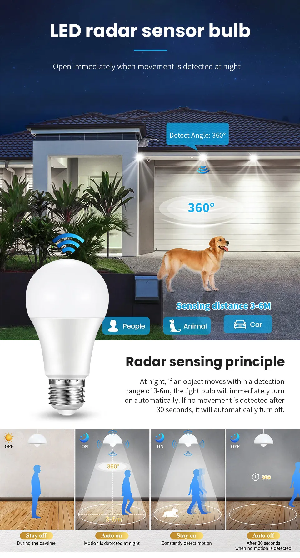 1. Adopting advanced radar detection technology, it is more sensitive and penetrating than infrared sensors. The radar sensor bulb can detect movement on the other side of the wall (the thickness of the wall should be less than 8 inches). Therefore, when it detects any object movement, it will open and automatically close after 20-30 seconds of no movement.