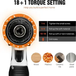 【18+1 Torque Settings】: The cordless screwdriver has a high torque of 45Nm, 18+1 torque settings are available to meet your needs, 1-4 for tightening small screws; 5-9 can roll up soft materials; 10-18 can roll up soft or hard materials; the last one can be drilled.