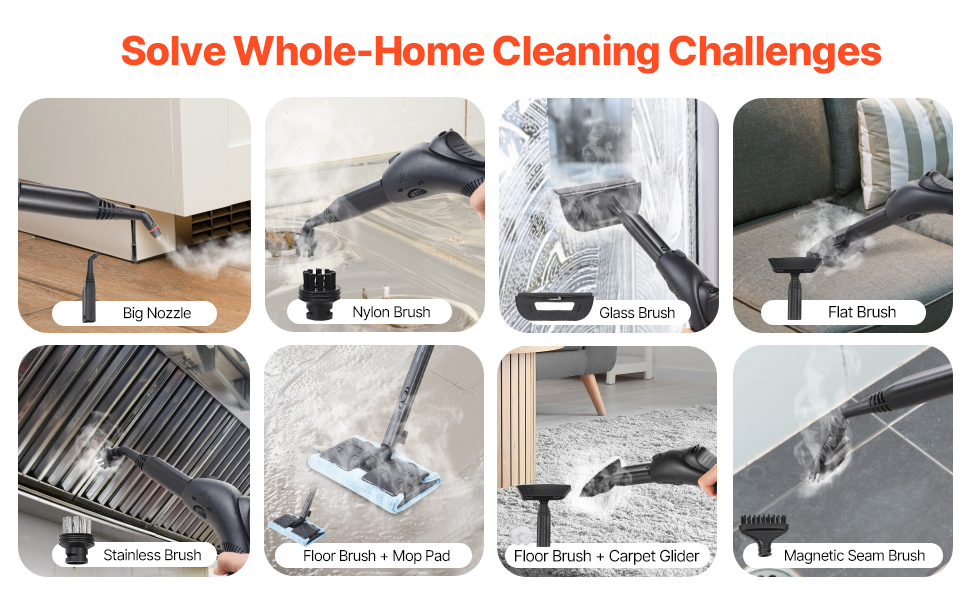 23 Accessories Included: Our grout steam cleaner comes with two extension tubes, a floor brush, two mop pads, a carpet glider, three nylon brushes, two stainless brushes, two magnetic seam brushes, a flat brush, a cloth cover, a glass brush, a wiper, a big nozzle, a straight nozzle to tackle every cleaning task. Note: A small amount of water spray is normal during use.
