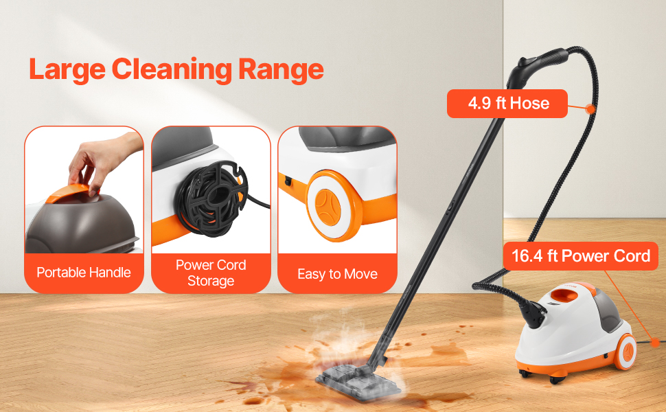 Larger Coverage Area: With an extra-long 4.9 ft / 1.5 m steam hose and 16.4 ft / 5 m power cord, this car detailing steamer offers excellent maneuverability and reach for hard-to-access areas. Swivel Wheels ensure effortless movement of the machine during cleaning, while the cord reel and steam head storage rack make it easier to store and organize.