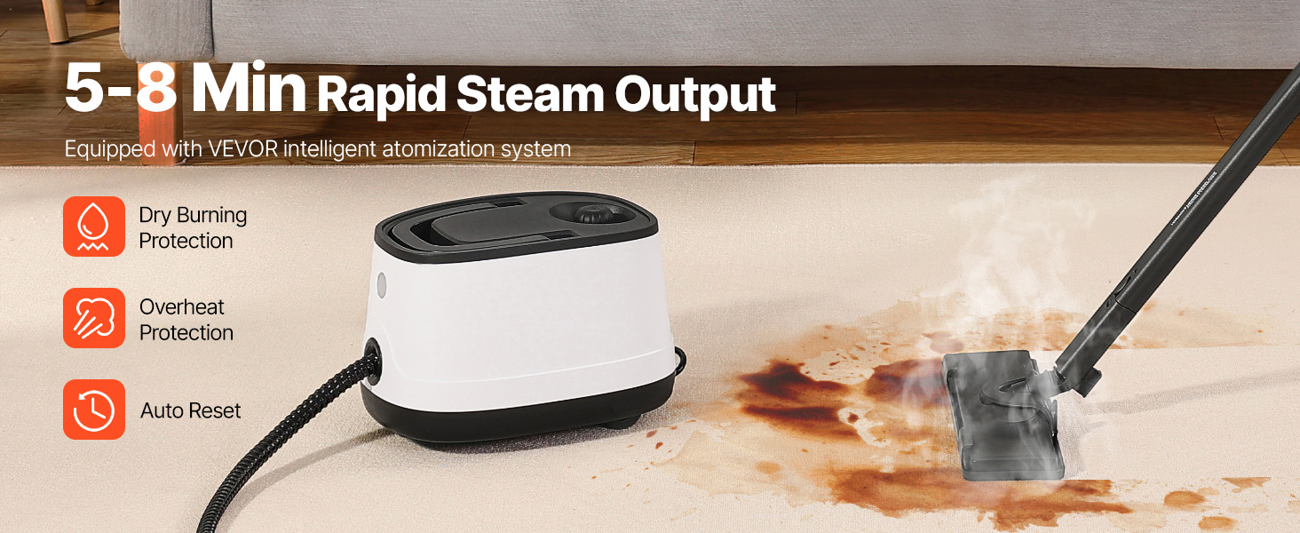 5-Minute Quick Heat-Up: With our intelligent atomization system and 1500W power, this steam cleaner heats up in 5-8 minutes. You can easily adjust the steam flow to clean tiles, marble, wood floors, carpets, and glass. Note: Power may vary by region.