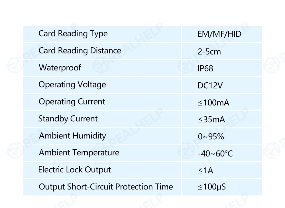 - Electric lock output: ≤1A