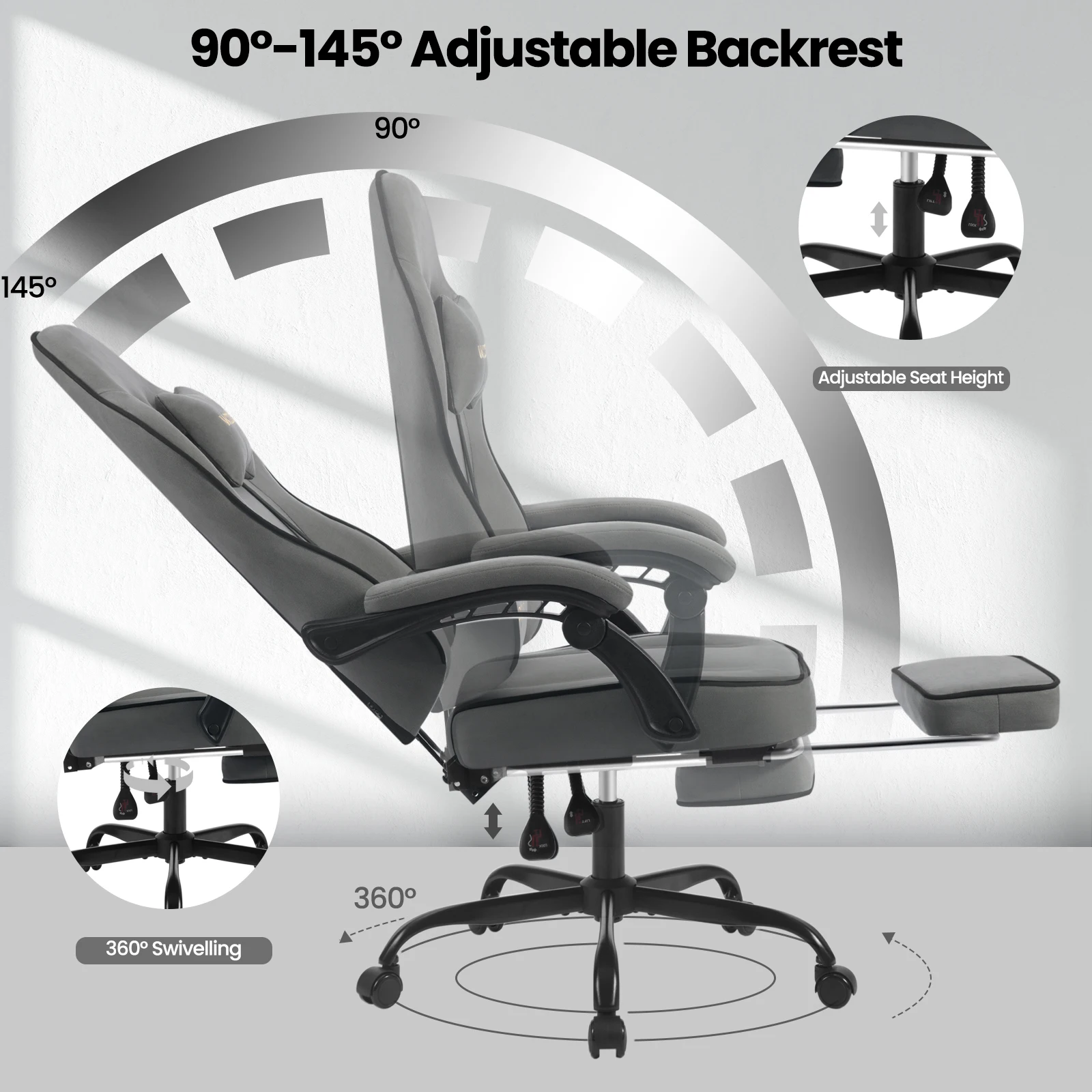 ERGONOMIC DESIGN: The ergonomic desk chair for home adapts well to your body curvature. With the adjustable head and lumbar cushion to support your neck and lower back, the height-adjustable and 360° rotating seat, the connected armrests that automatically adjust to the angle (maximum 145°) when leaning, and the foldable footrest, you can relax well
