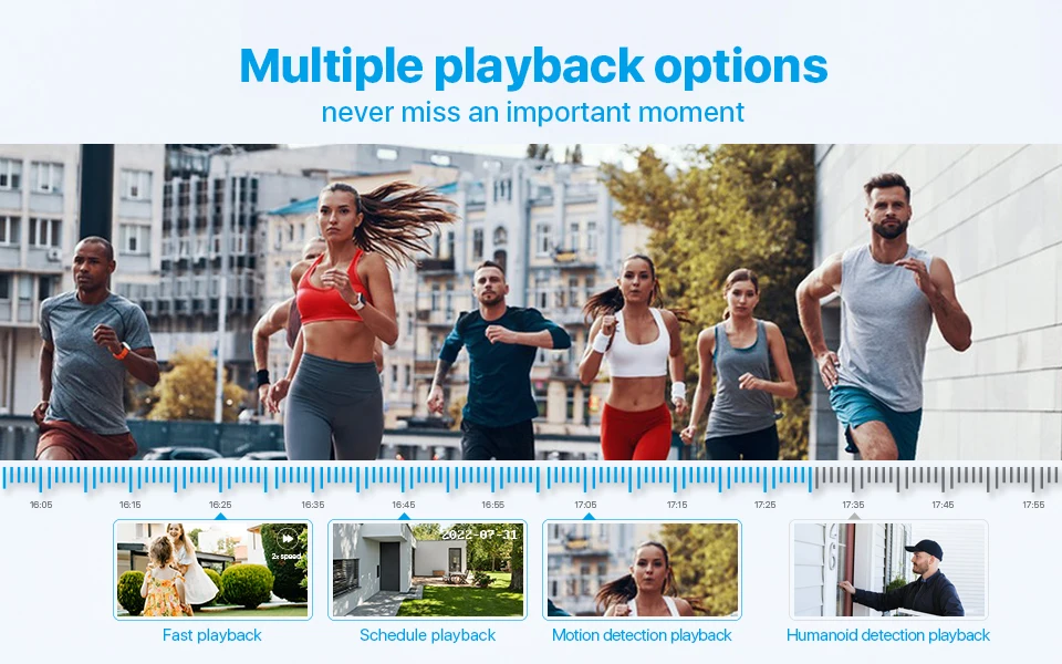 The system supports four playback modes: Fast playback, Schedule playback, Motion detection playback, Humanoid detection playback. You can choose any playback mode to save your time and not miss any moment.