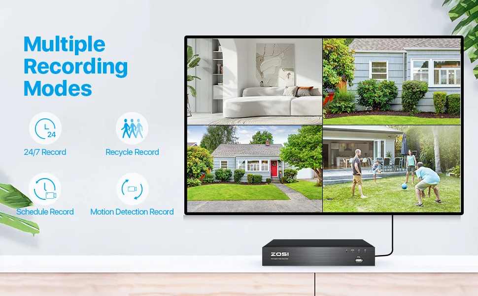 ZOSI NVR offers 4 kinds recording modes to meet your needs: Continuous Record ; Scheduled Record; Motion Detect Record; Recycle Record.You can customize each camera with different recording modes, which allows you to save space on the hard drive.