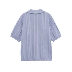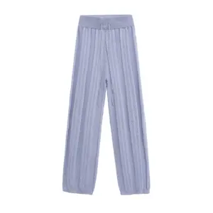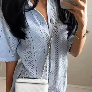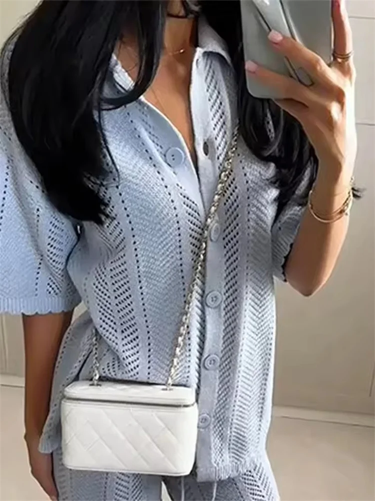 Casual Knit Pants Suits Women Lapel Half Sleeve Hollow Out Single Breasted Top Female 2025 Summer Elastic Waist Pant Outfits Set