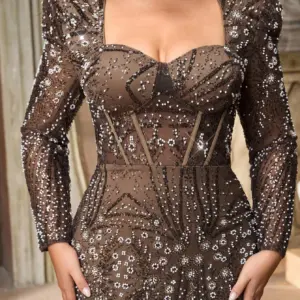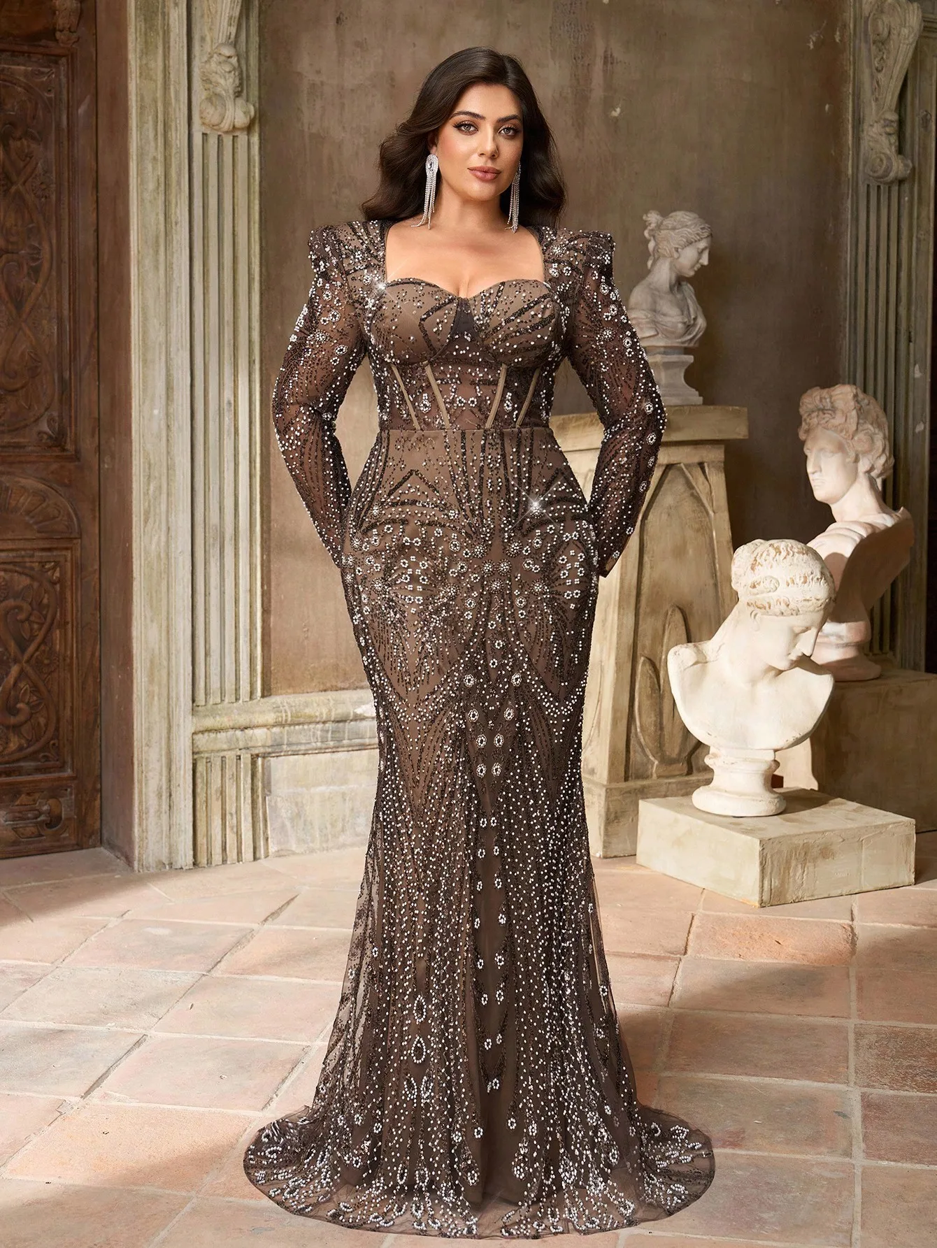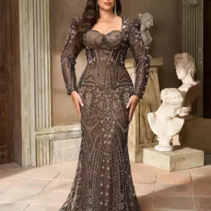 This elegant plus size gown features a sweetheart neckline and long puff sleeves, crafted in sheer mesh with intricate geometric beading. The fitted bodice and mermaid silhouette accentuate curves, while the floor-length hem adds drama. Perfect for formal occasions including weddings, banquets, and evening parties.