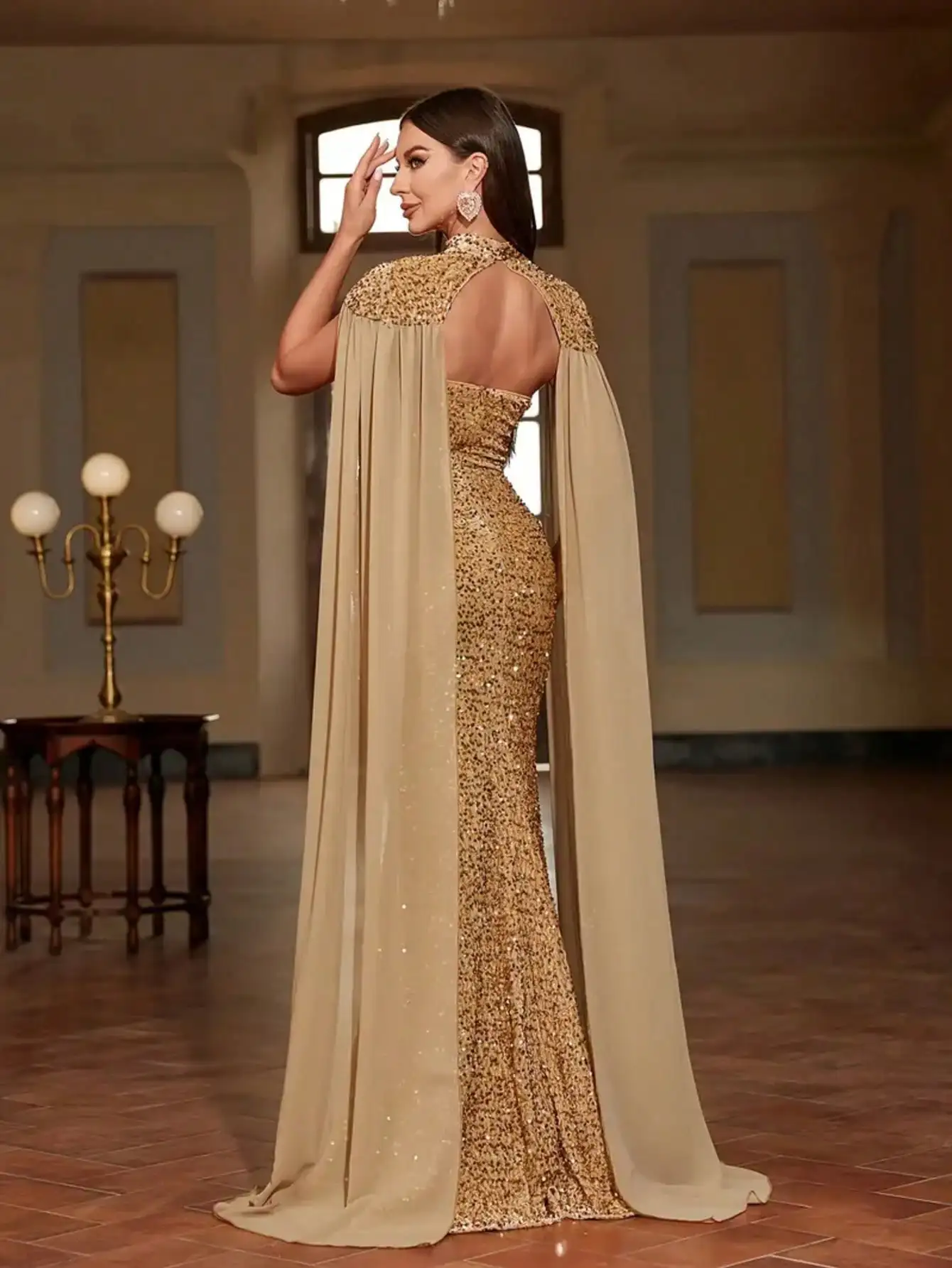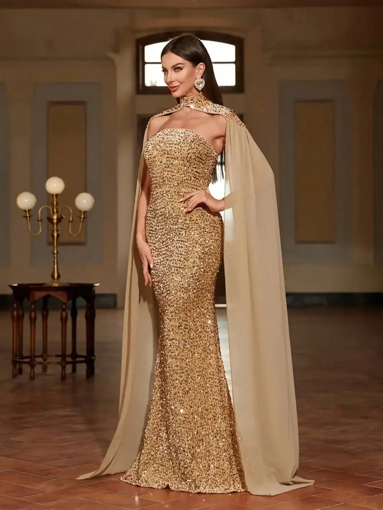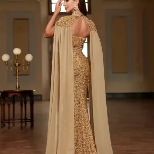 Sparkly Gold Sequin Mermaid Gown with Detachable Cape, Strapless Evening Dress for Parties & Banquets