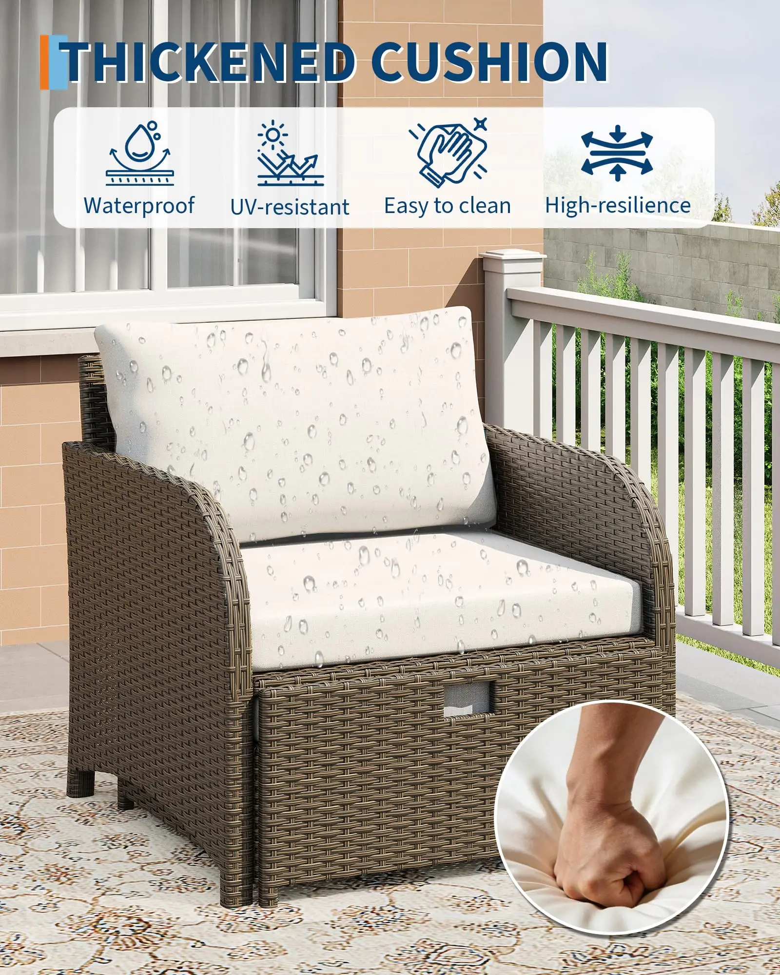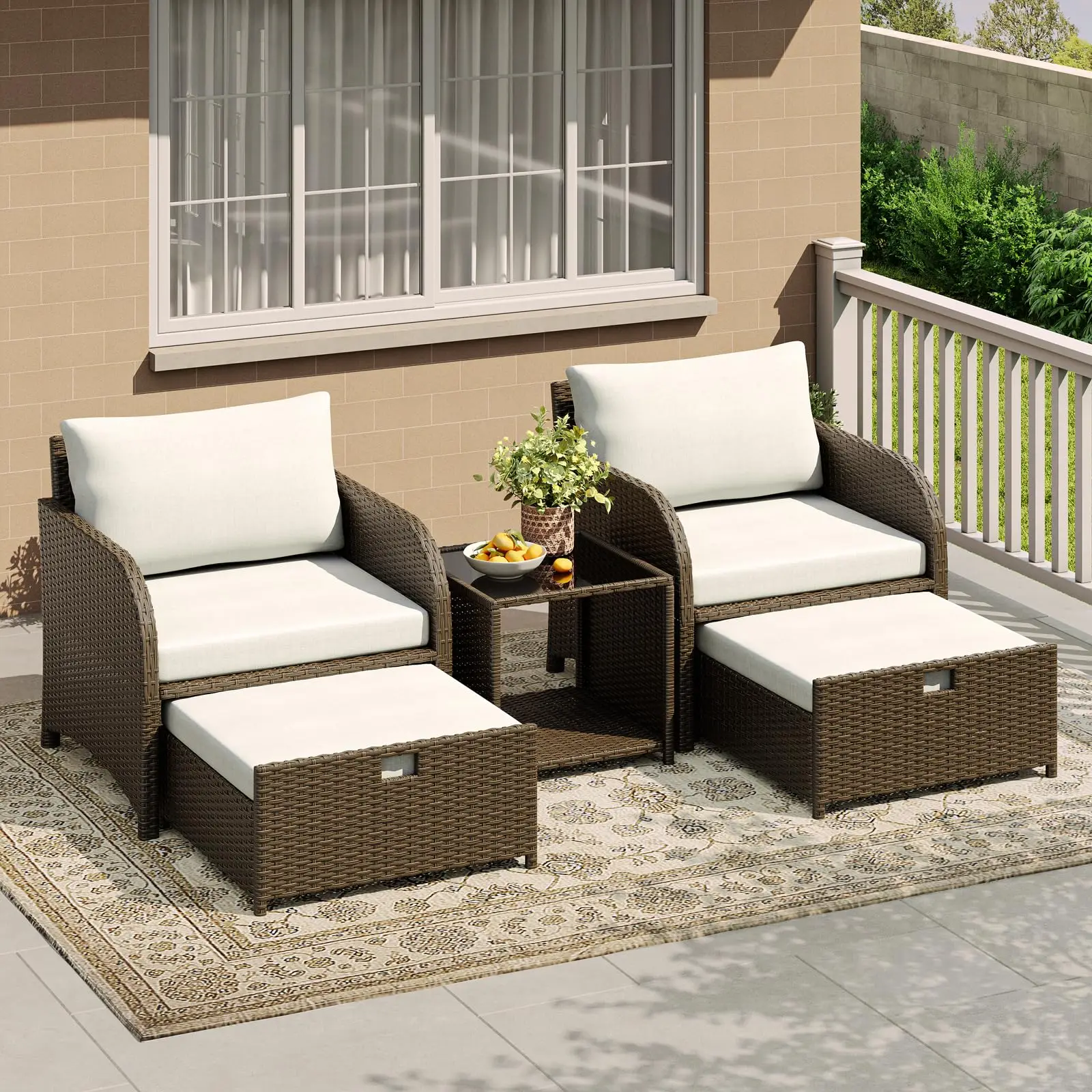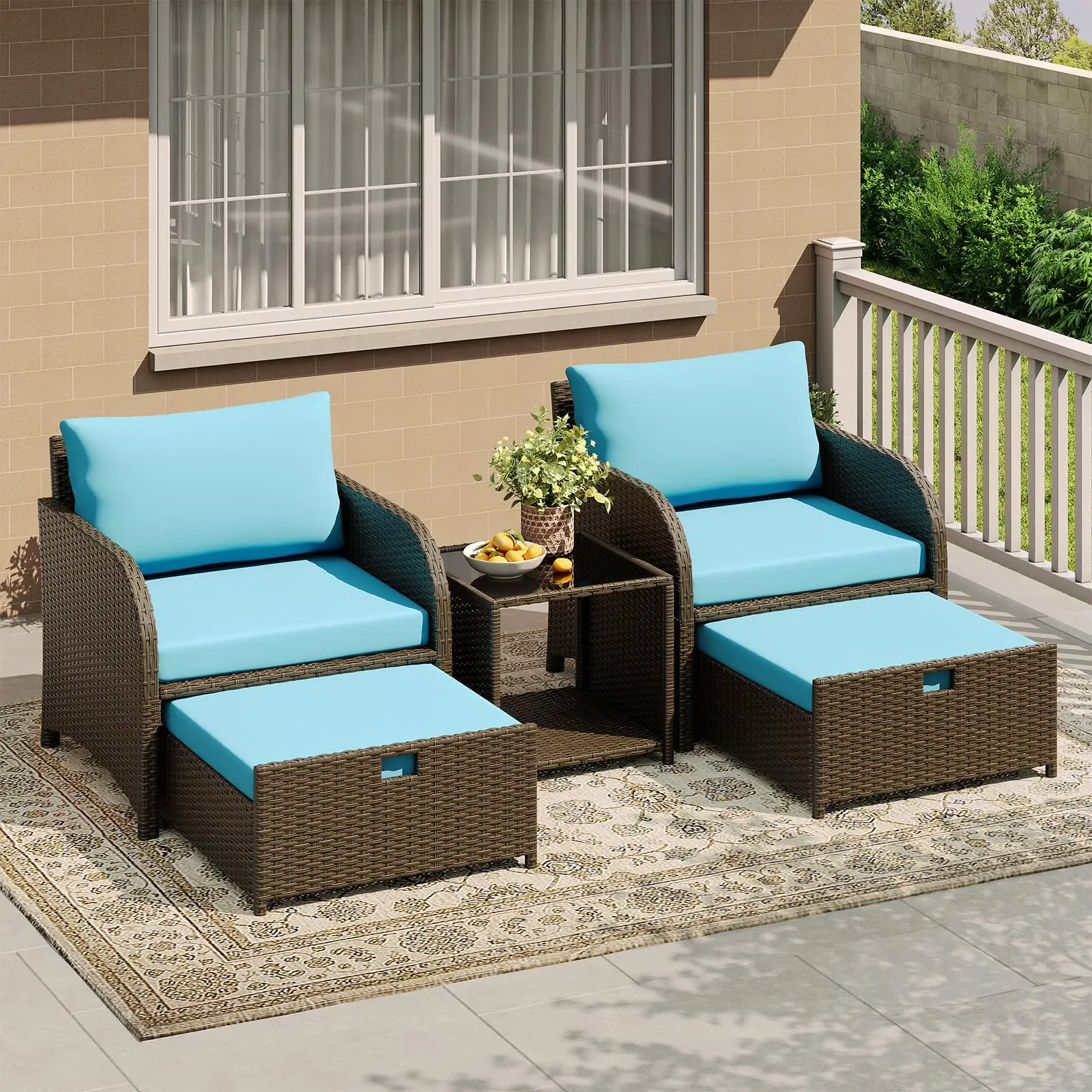 �� Modular & Versatile Designs.This 5-piece wicker patio furniture set features a flexible modular layout, allow you to free combine 2 single chairs, 2 Ottomans and 1 side table to fit any balcony, patio or garden space. The Ottomans can be used as extra seats, foot rest or hidden storage, perfect for adapting to different gathering needs.