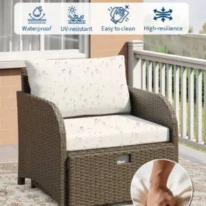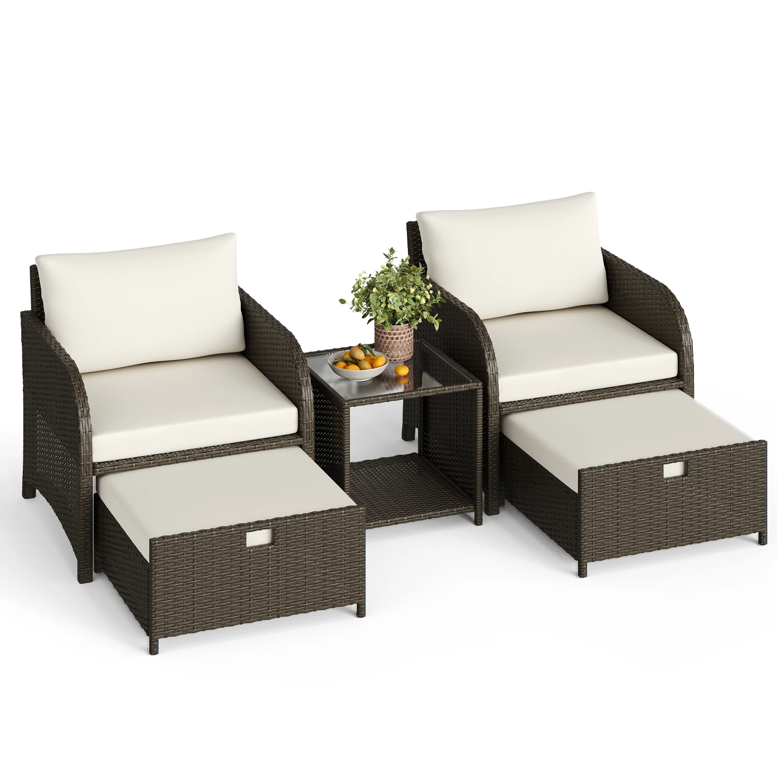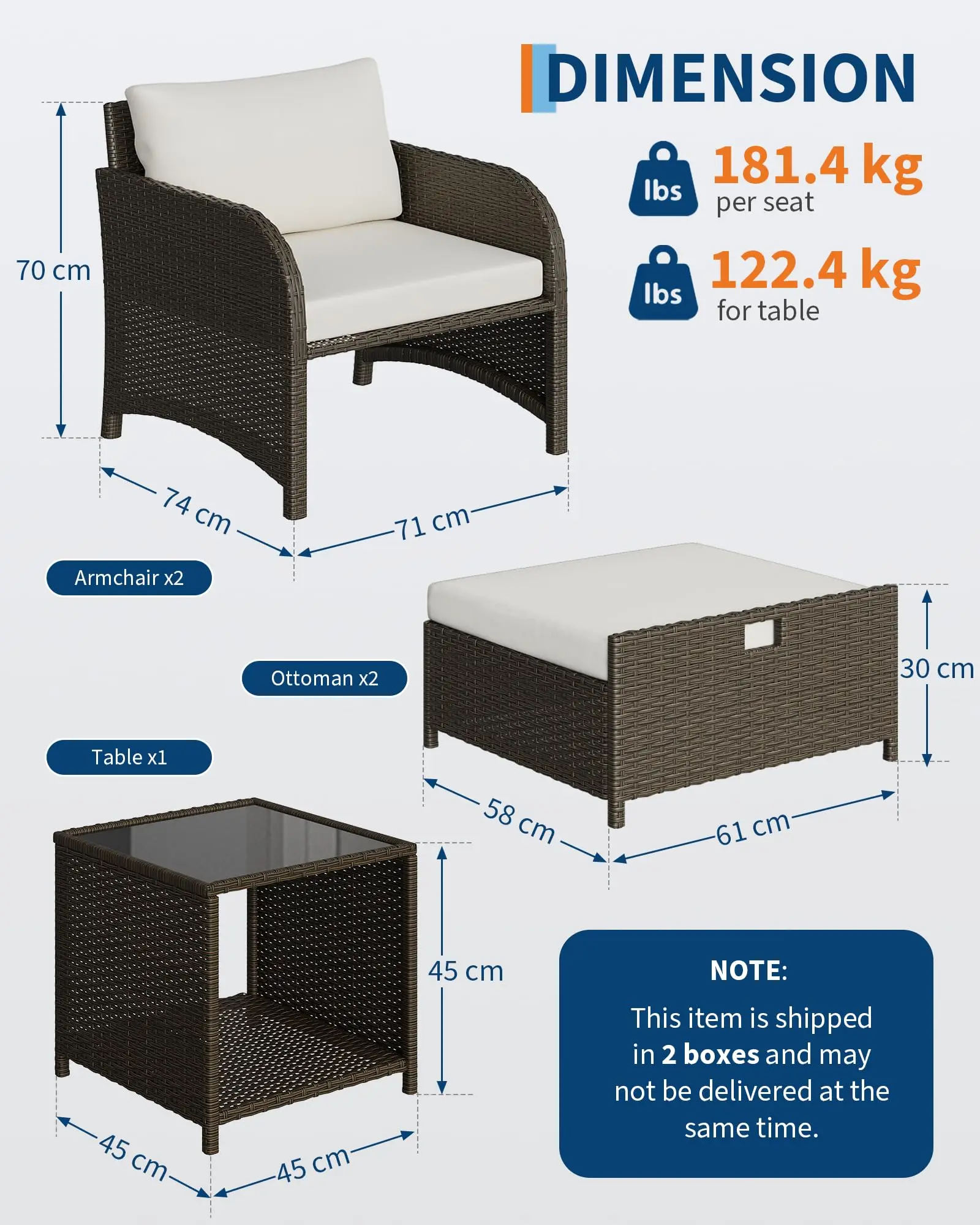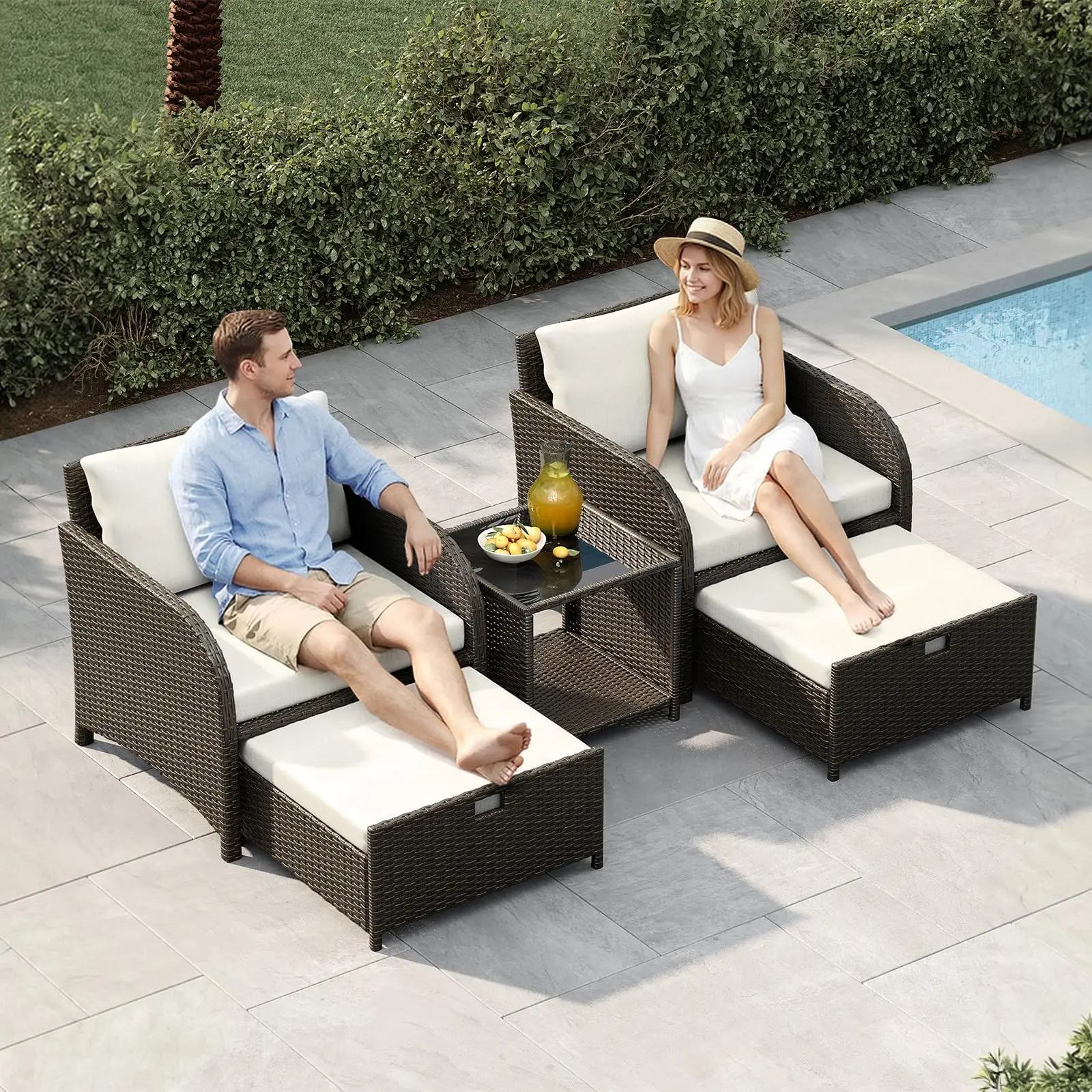�� Modular & Versatile Designs.This 5-piece wicker patio furniture set features a flexible modular layout, allow you to free combine 2 single chairs, 2 Ottomans and 1 side table to fit any balcony, patio or garden space. The Ottomans can be used as extra seats, foot rest or hidden storage, perfect for adapting to different gathering needs.