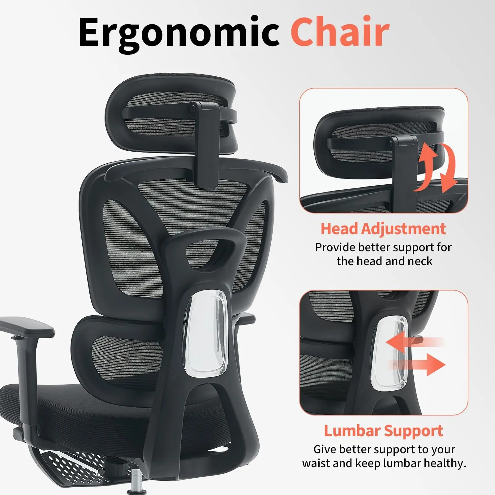 Ergonomic office chair with full-body support, adjustable lumbar, seat height, and recline for personalized comfort during long work or study sessions.