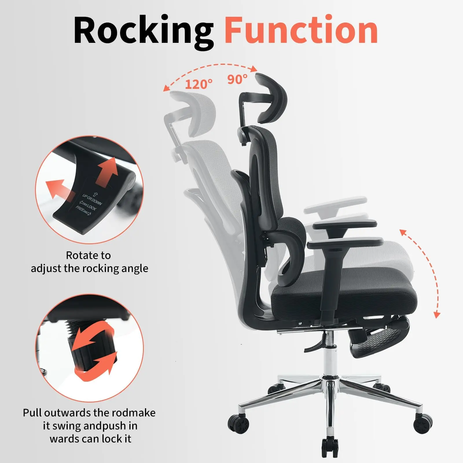 Integrated retractable footrest and reclining backrest (90°–120°) allow you to quickly switch from work mode to relaxation, easing leg stress and restoring energy.
