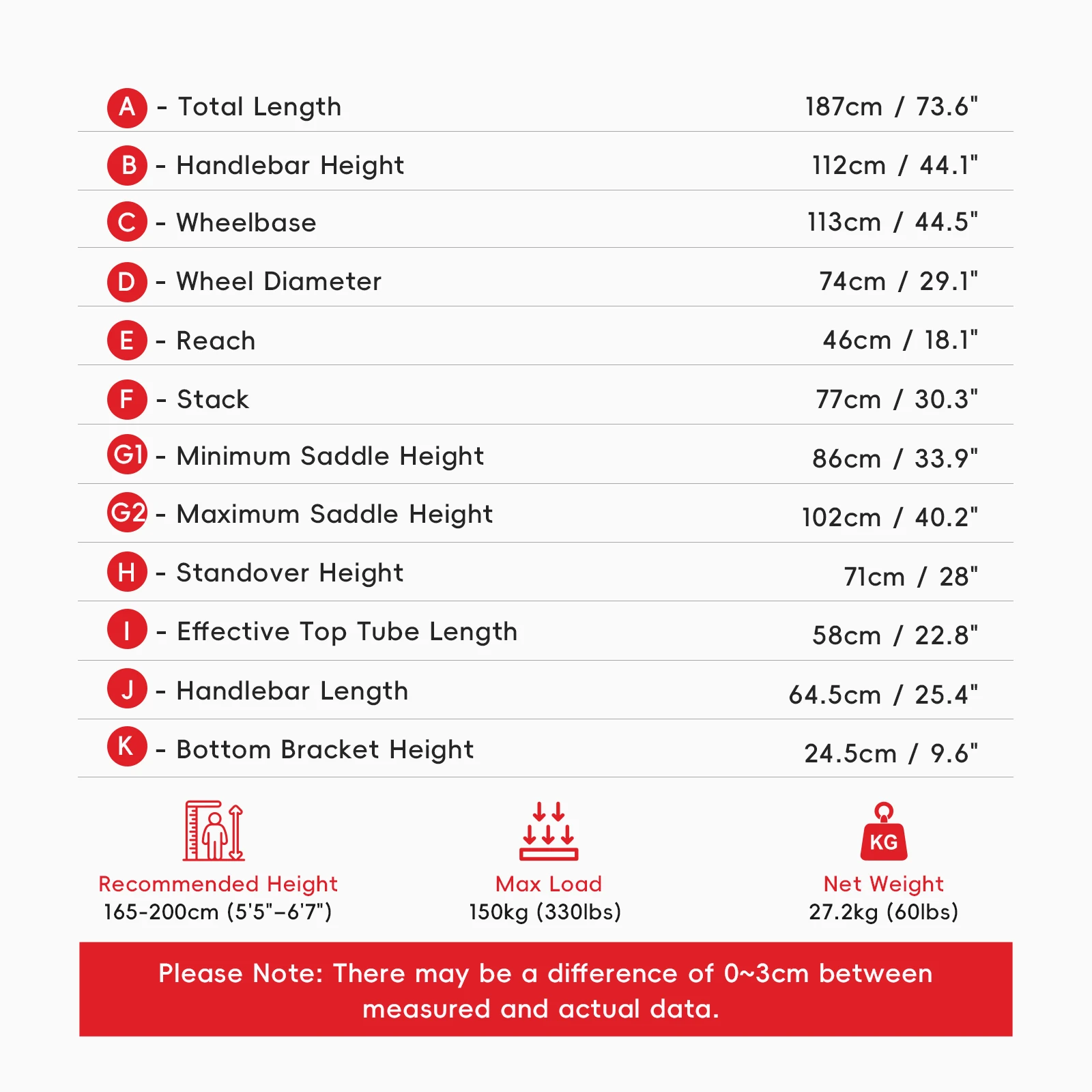 - Recommended Rider Height: 165-200cm (5’5″-6’7″)