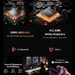 Powered by AMD Radeon 680M Graphics (12 cores, 2200 MHz), this mini PC supports triple display output via HDMI, DisplayPort, and Type-C. It delivers powerful graphics performance to handle complex design software with ease, while offering stunning 4K visuals for exceptional clarity, immersive viewing, and maximum productivity.