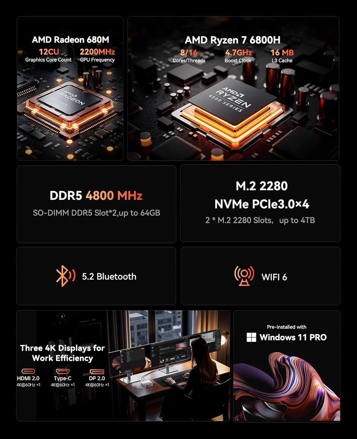 mini computer is equipped with AMD Ryzen 7 6800H processor (8C/16T, 16M Cache, 3.2GHz up to 4.7GHz,) With Hyper-Threading technology, it delivers enhanced single-core and multi-core performance. Widely used in commercial offices, it also serves well as a home media center, virtual machine, router, or even a server.