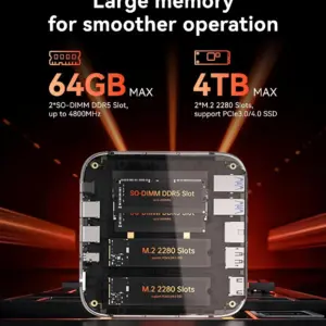 This mini computer comes with 32GB DDR5 memory (dual-channel expandable up to 64GB) and a fast 1TB PCle SSD, enabling smooth multitasking and high-performance operations. For even greater storage, you can easily add a 2.5″ SSD (not included) to expand up to 4TB, giving you the flexibility to meet your growing work and entertainment needs.