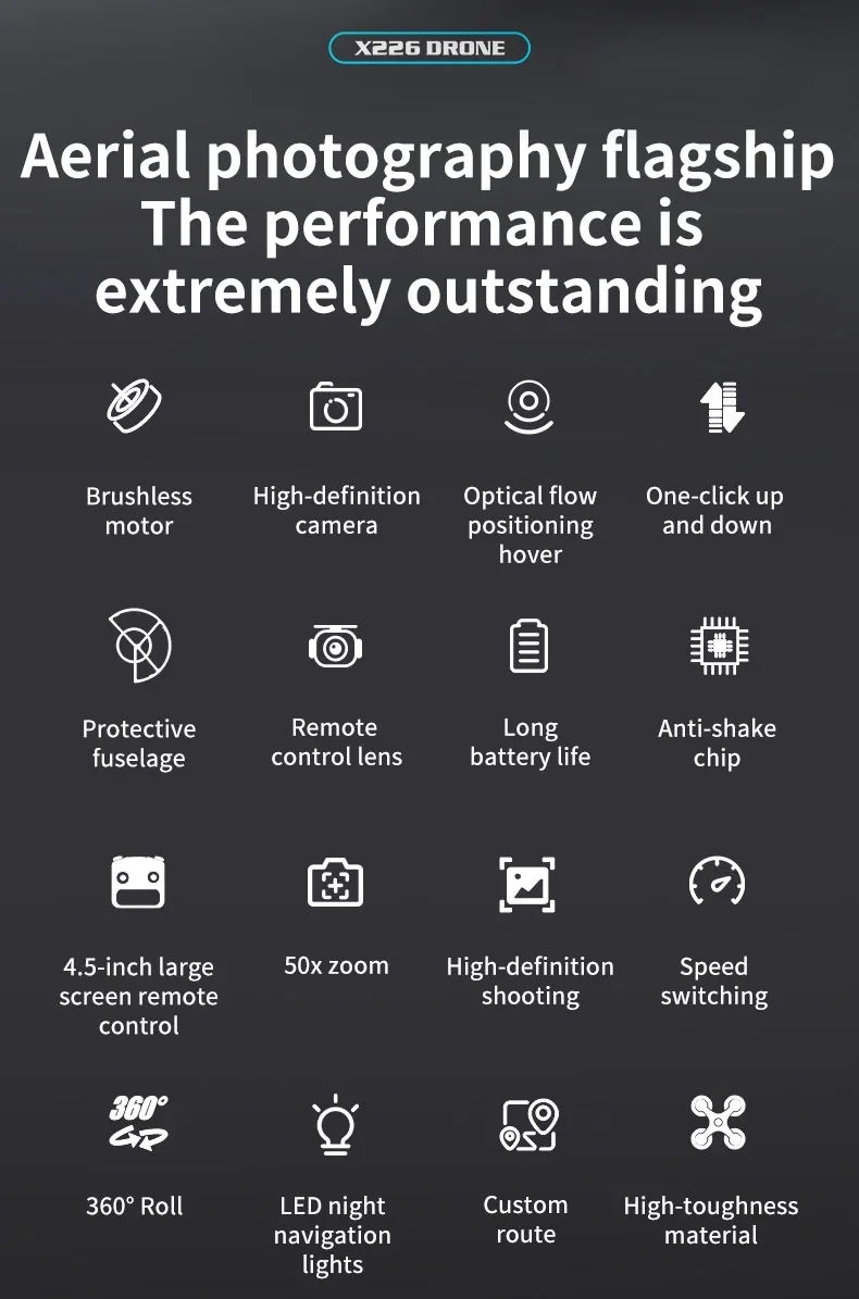 V226-brushless motor, with 4.5-inch remote controller with screen, electric adjustment camera, optical flow height setting function, dual camera switching, speed switching, headless mode, six channels with gyroscope, roll