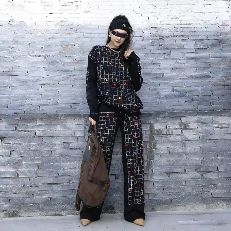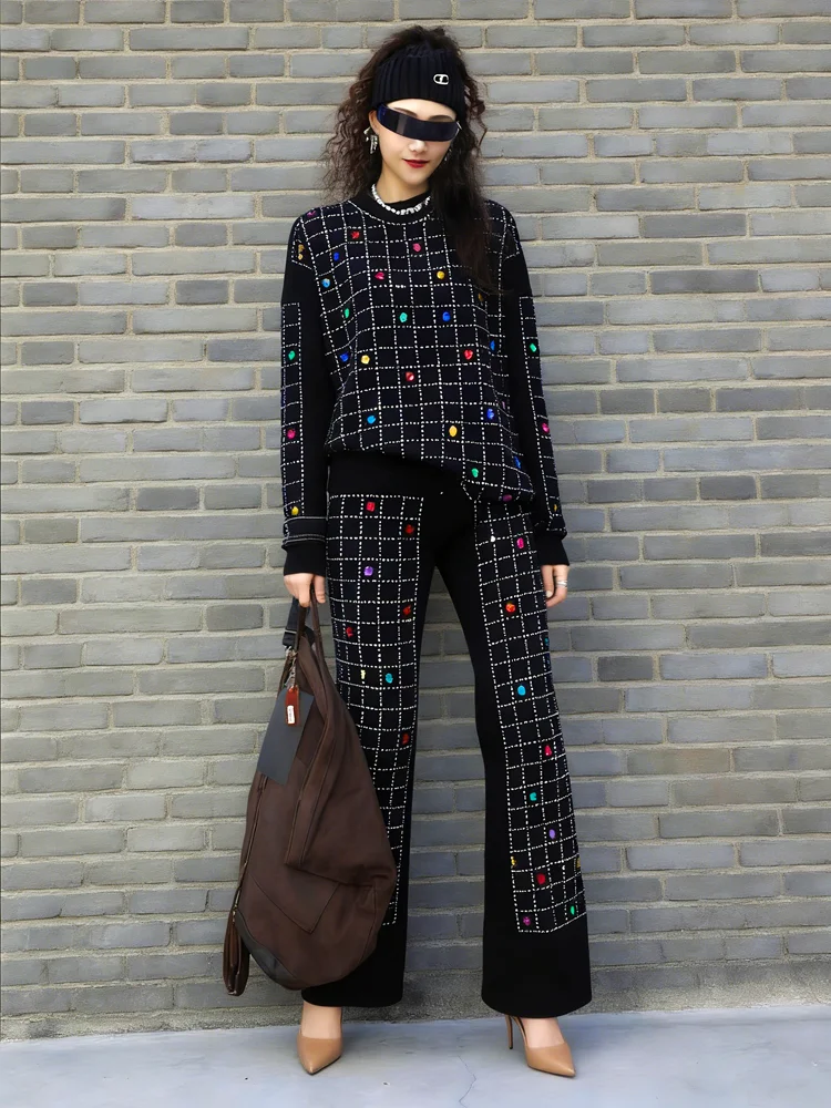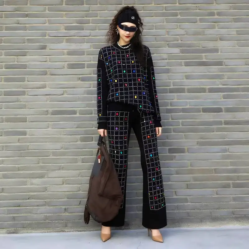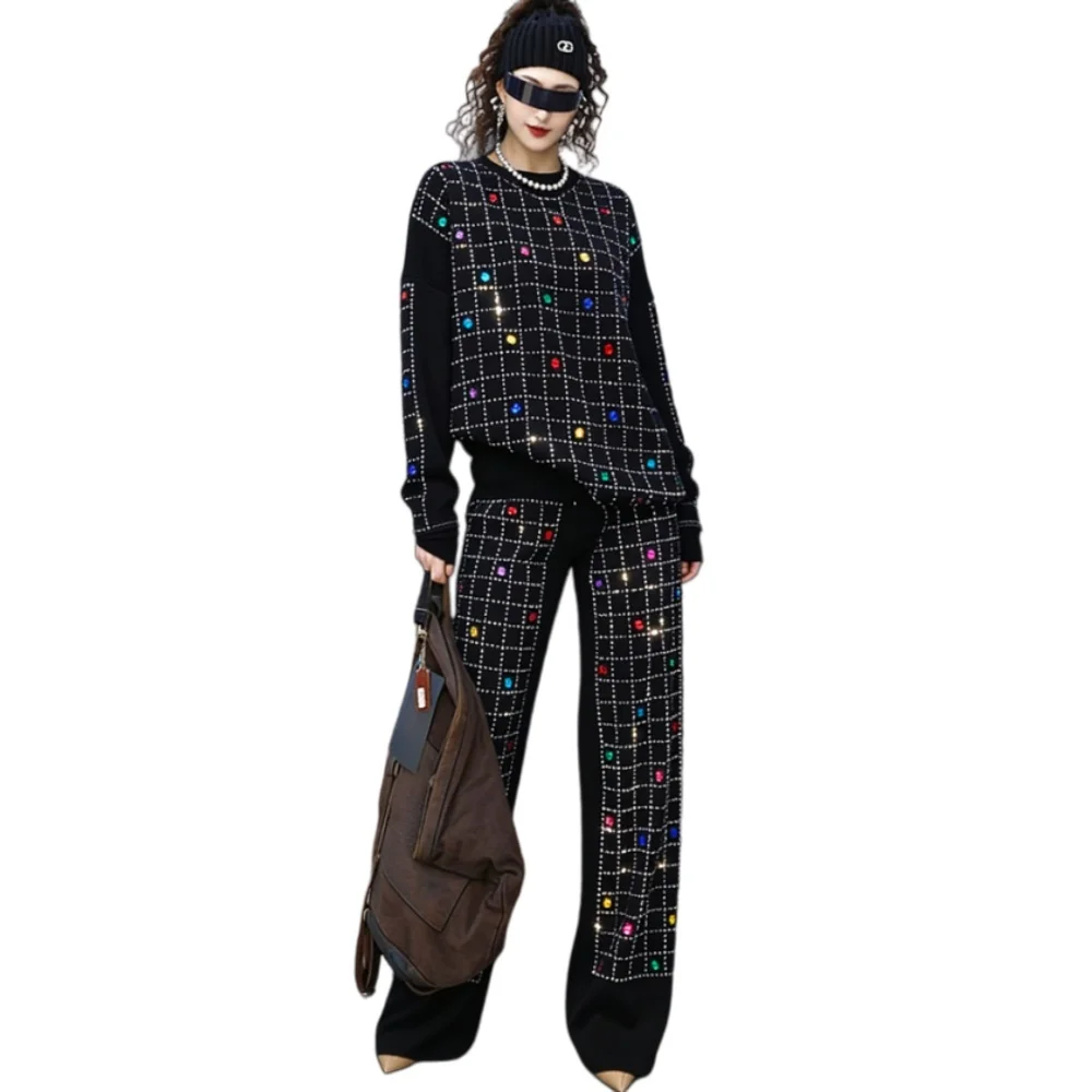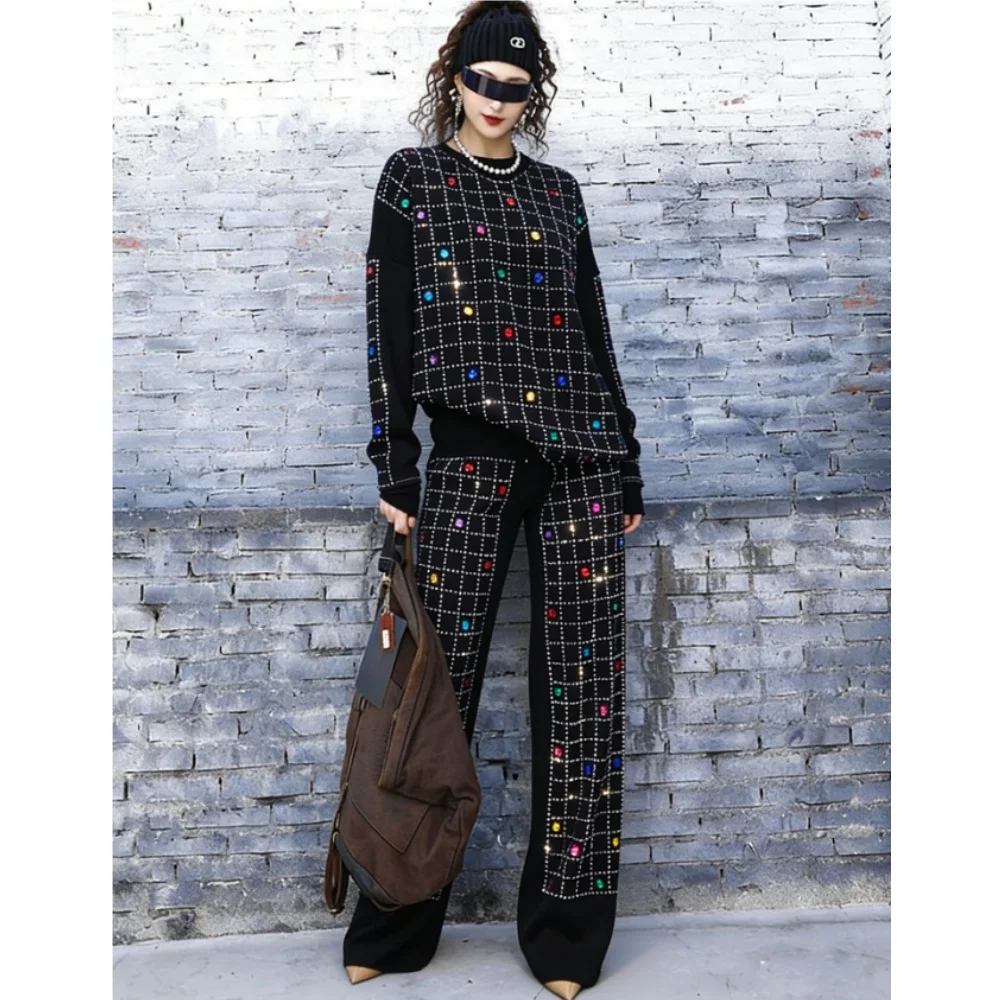2026 Spring New Women Pant Set Rhinestone Print Two-Piece Knit Set Black Outfit LX5169