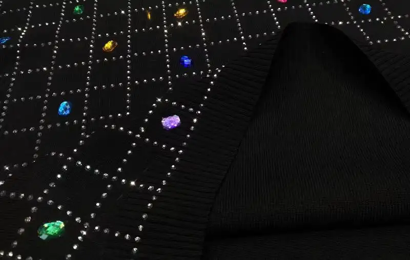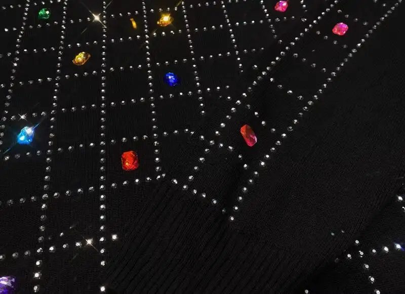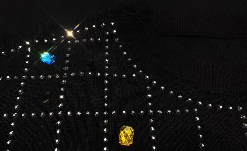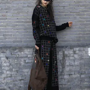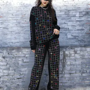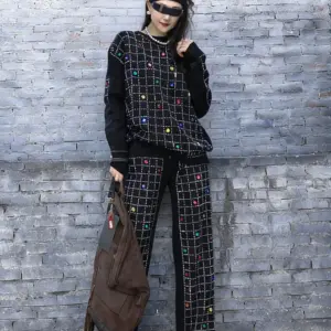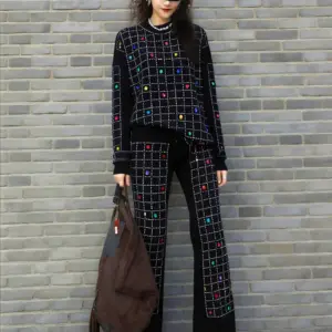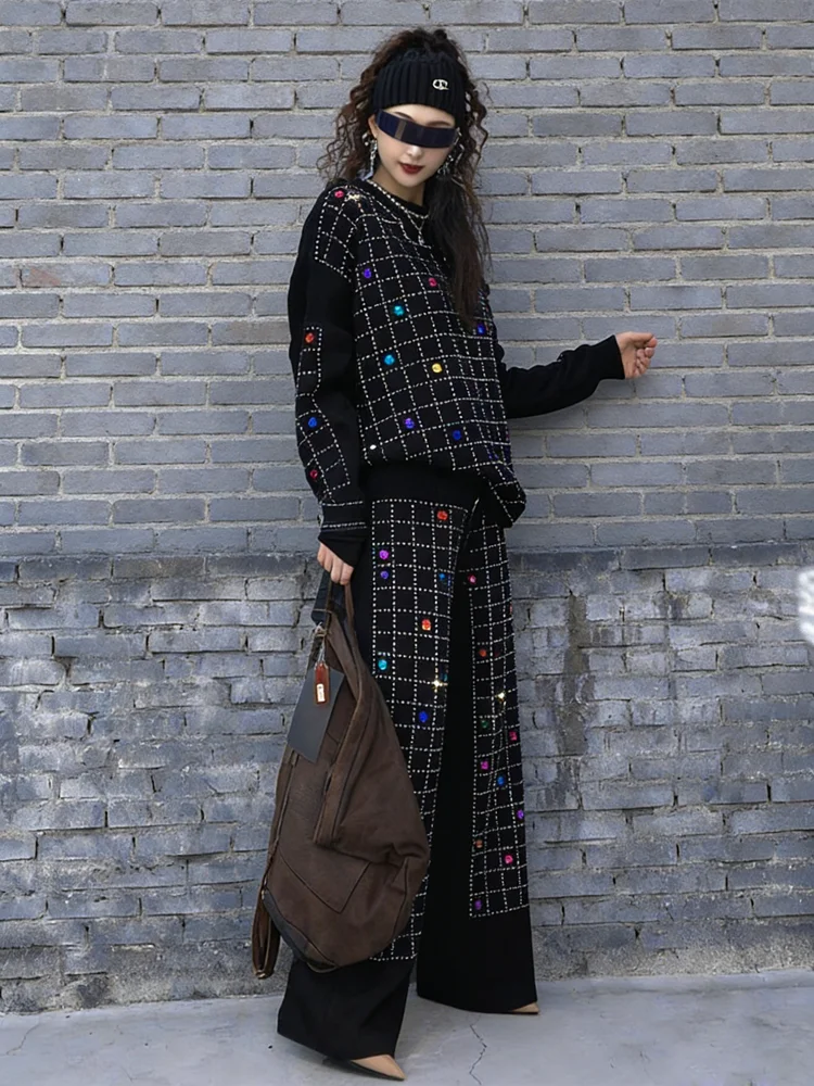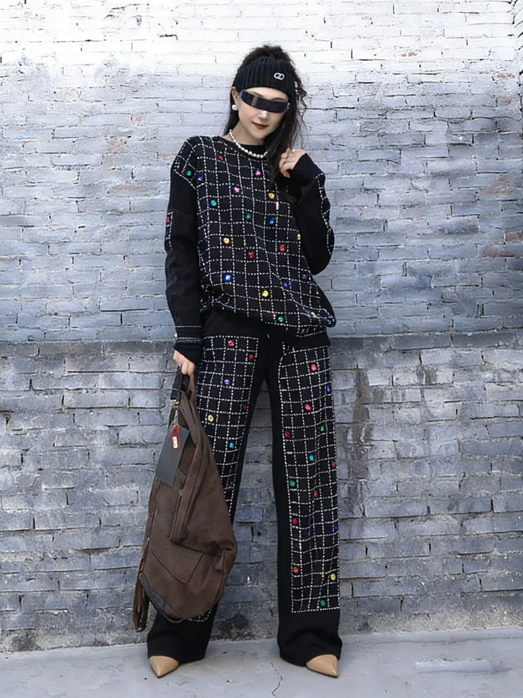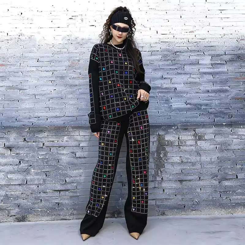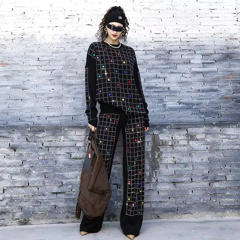 2026 Spring New Women Pant Set Rhinestone Print Two-Piece Knit Set Black Outfit LX5169
