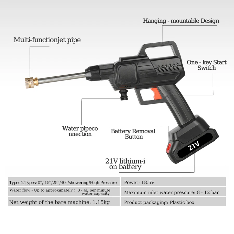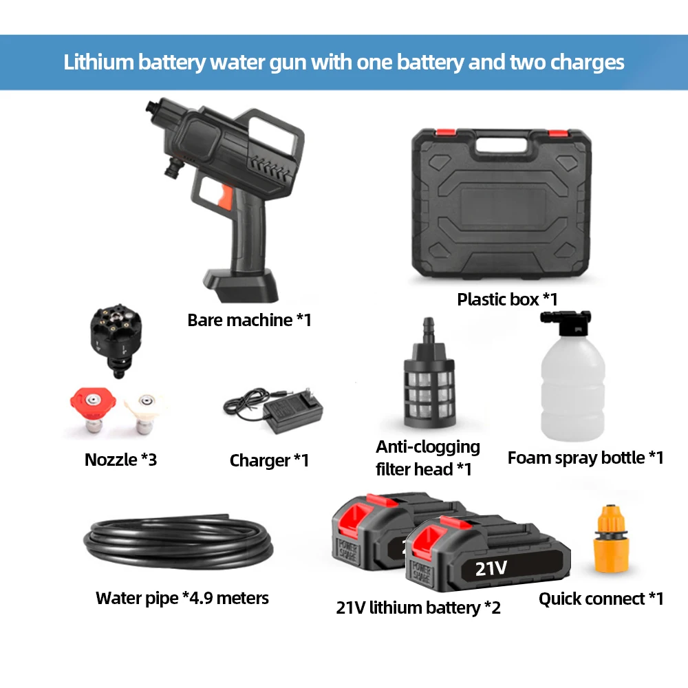 4. [Durable 1.5Ah lithium battery] This high-voltage cleaning machine weighs about 2 kilograms and is powered by a 1.5Ah battery. Our high-voltage cleaning machine is not limited by wires, so you can clean it anytime and anywhere. The battery life is about 30 to 45 minutes, depending on different water pressures. Whether you are cleaning your car or bicycle on the go, or just want to clean your boots after a hiking trip, our high-pressure cleaning machine is perfect for carrying with you and also provides high-pressure cleaning.