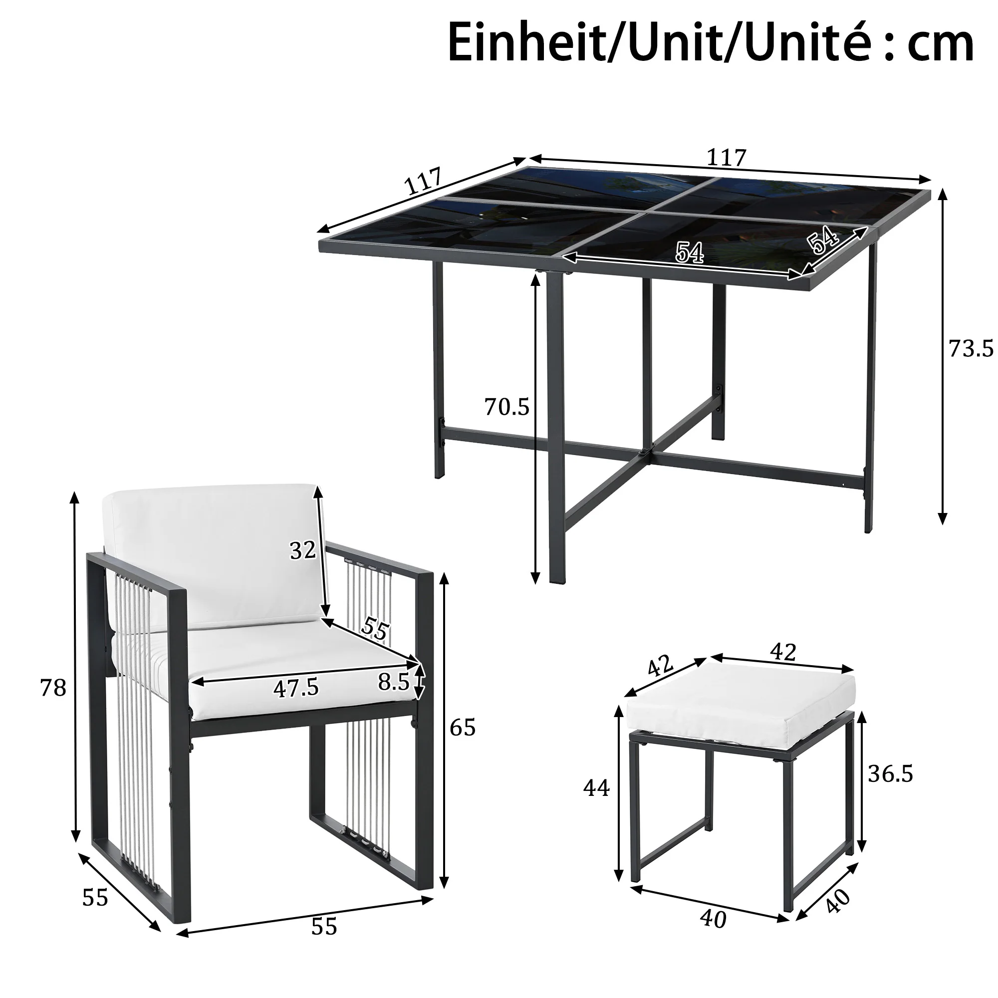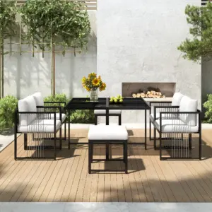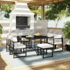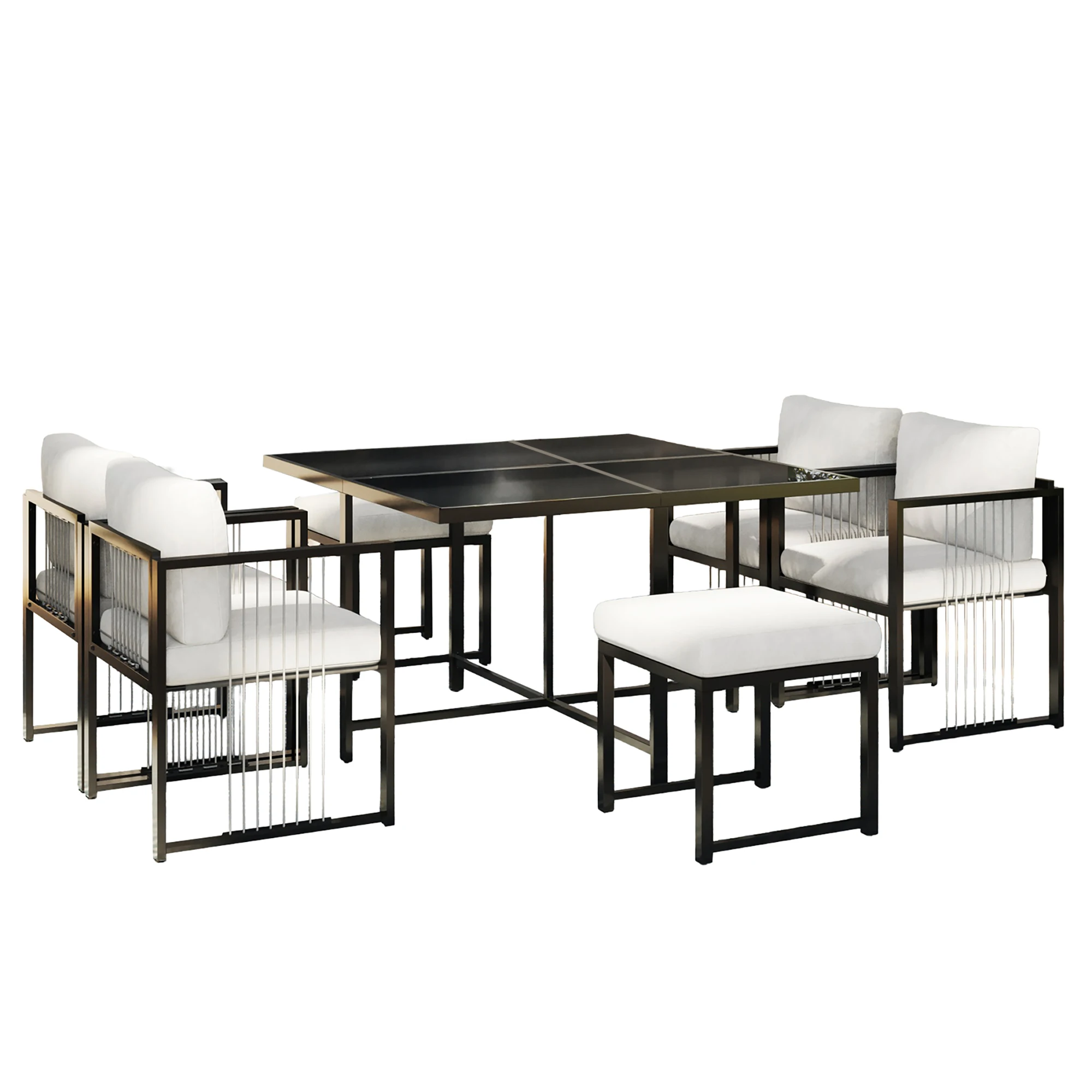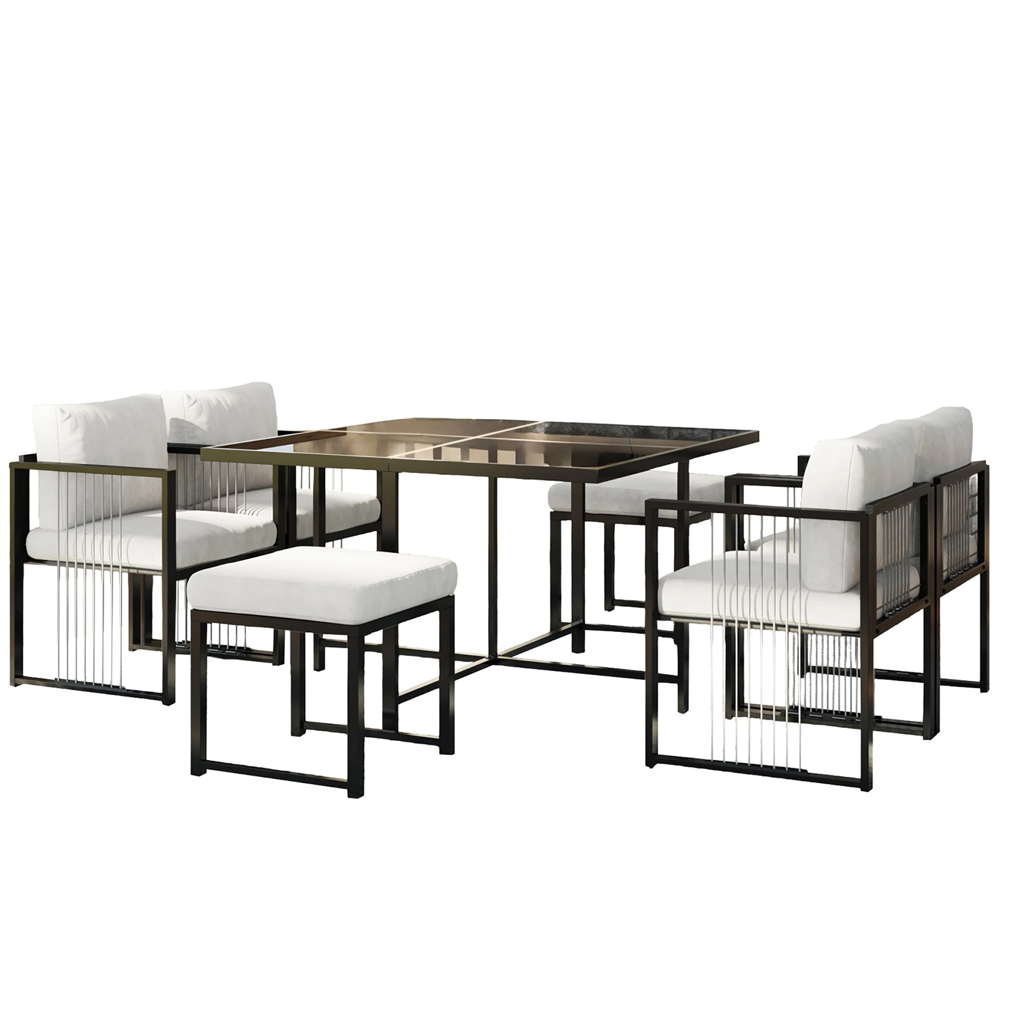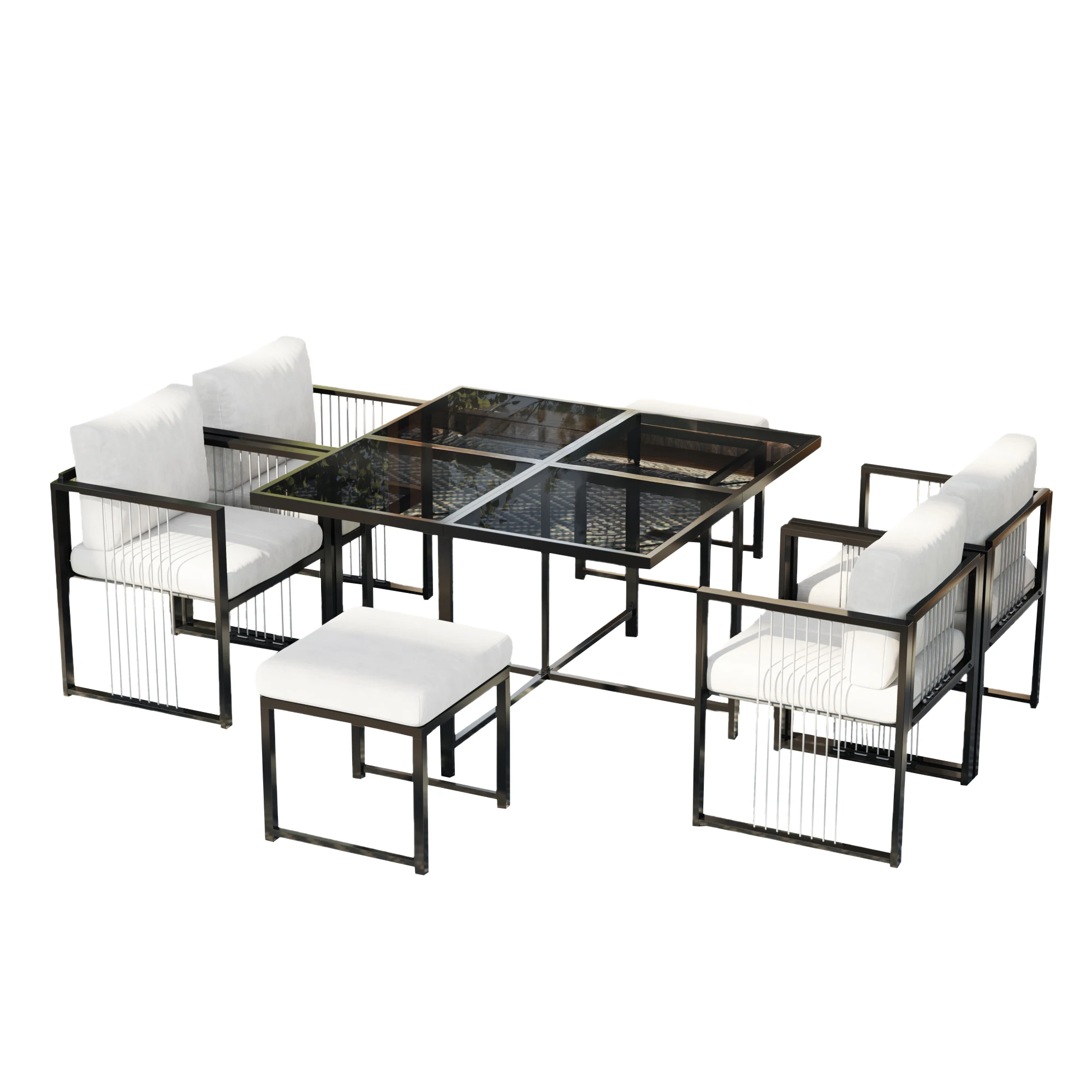 1. Spacious and Comfortable: This set includes a square table (117×117 cm), four chairs, and two footstools, comfortably accommodating up to six people, making it perfect for outdoor gatherings.