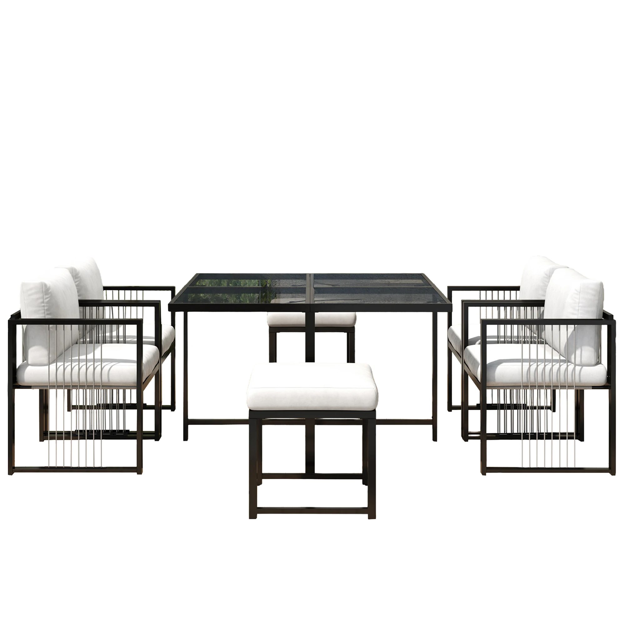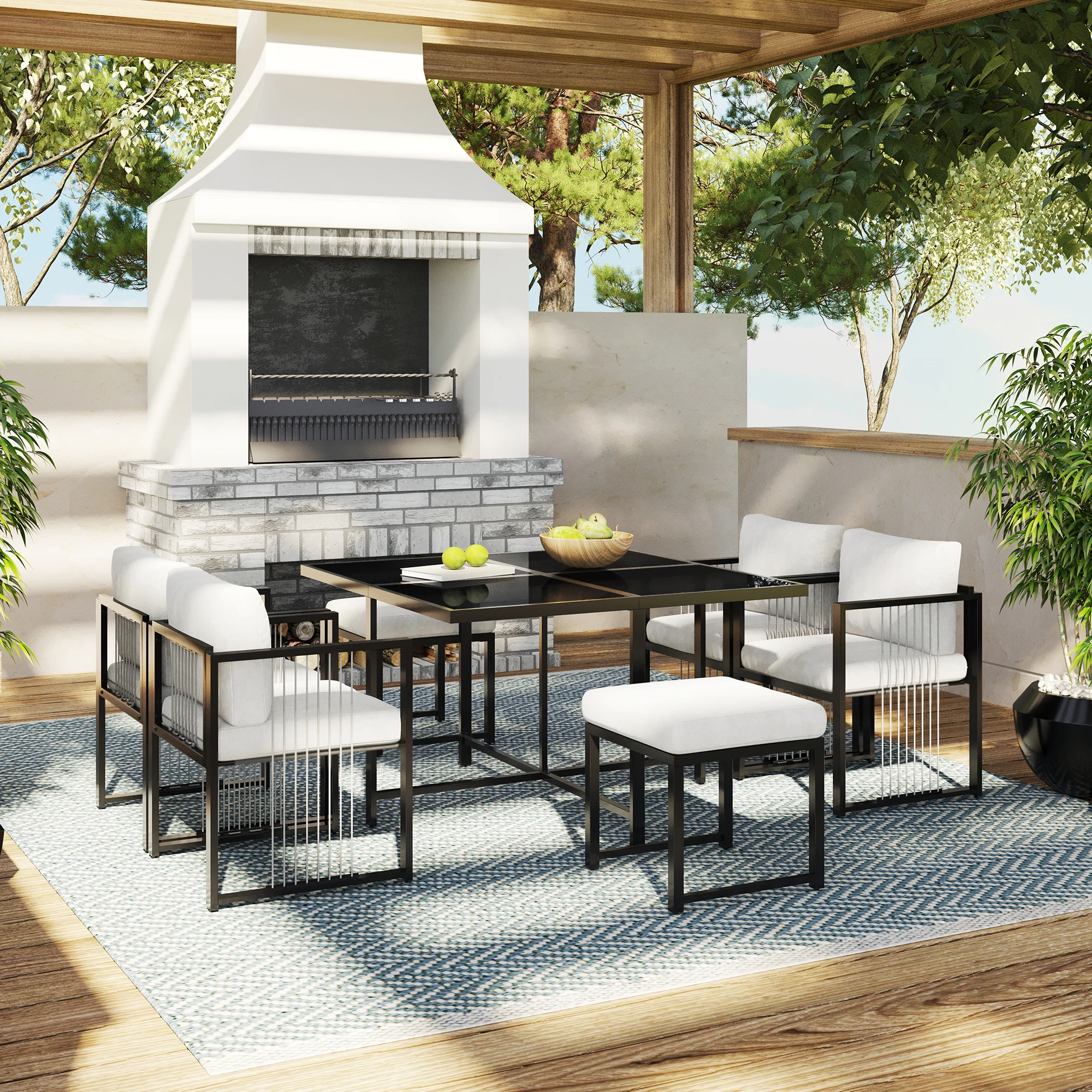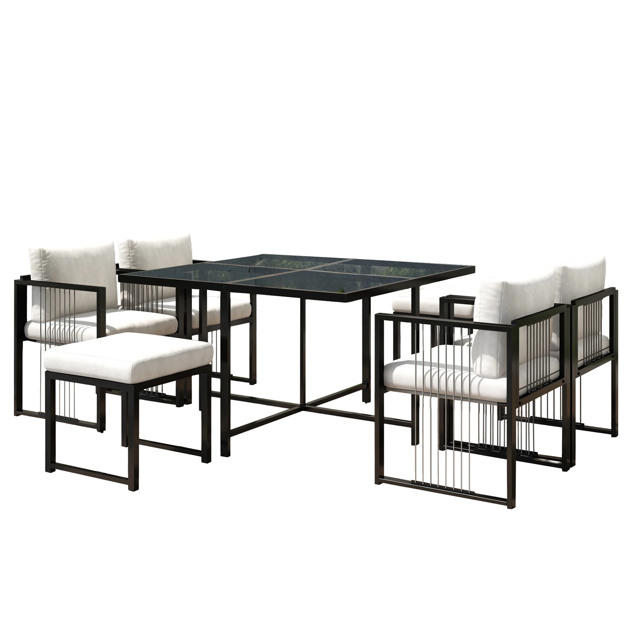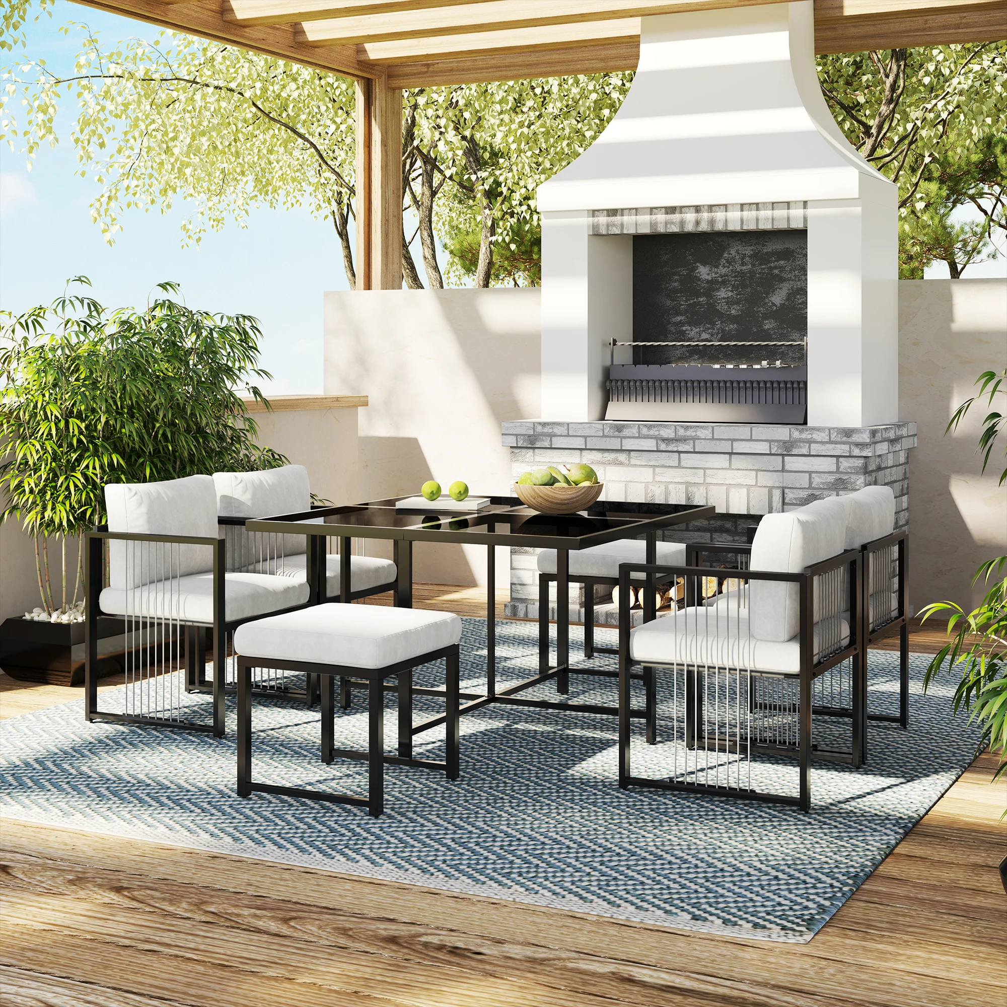 1. Spacious and Comfortable: This set includes a square table (117×117 cm), four chairs, and two footstools, comfortably accommodating up to six people, making it perfect for outdoor gatherings.