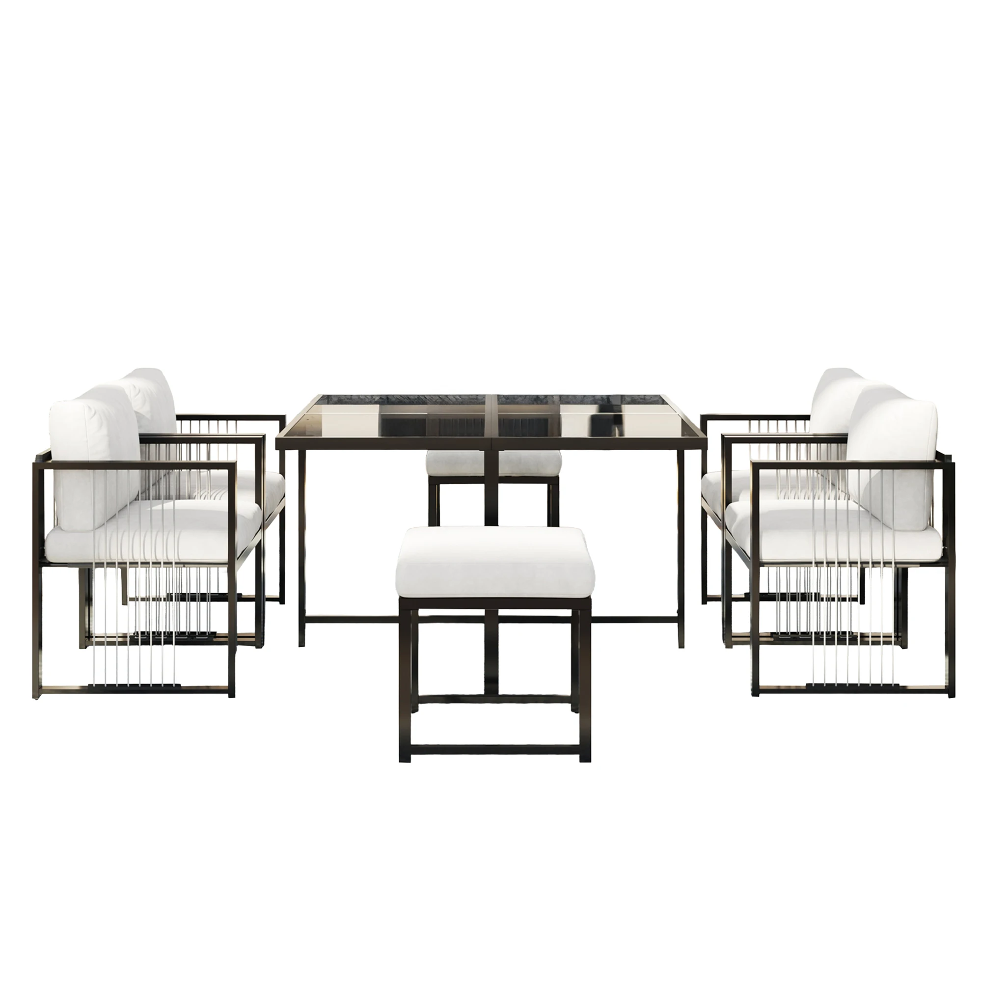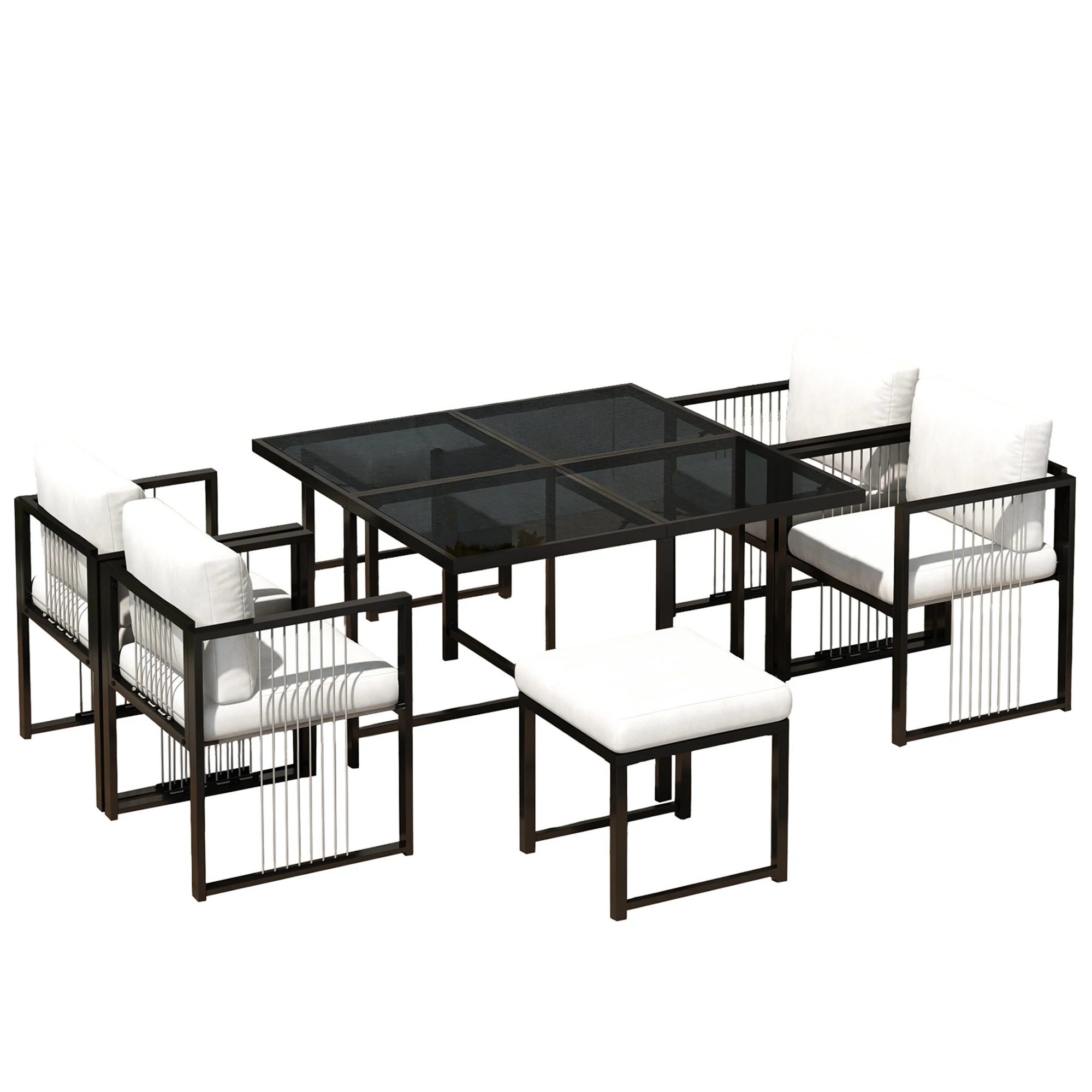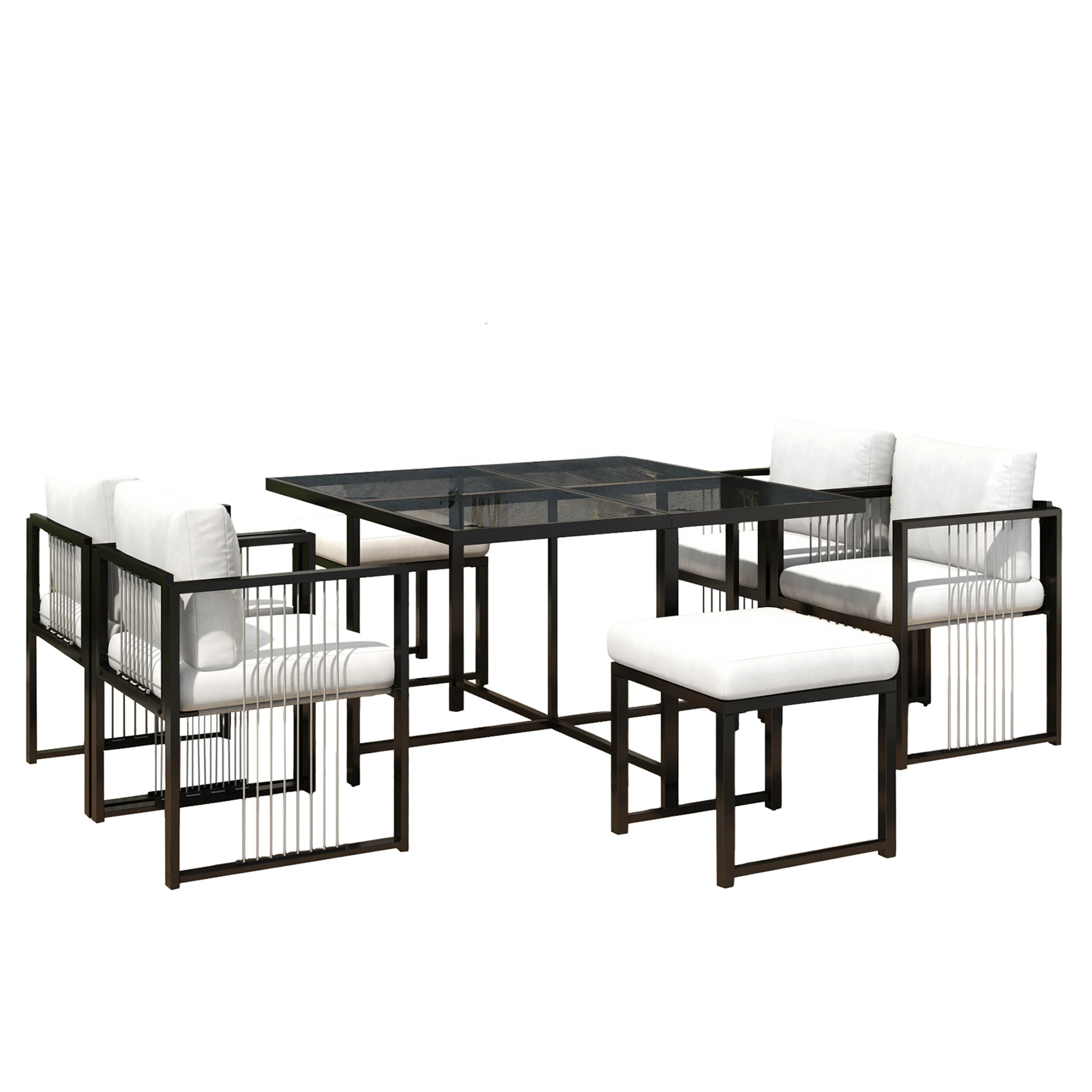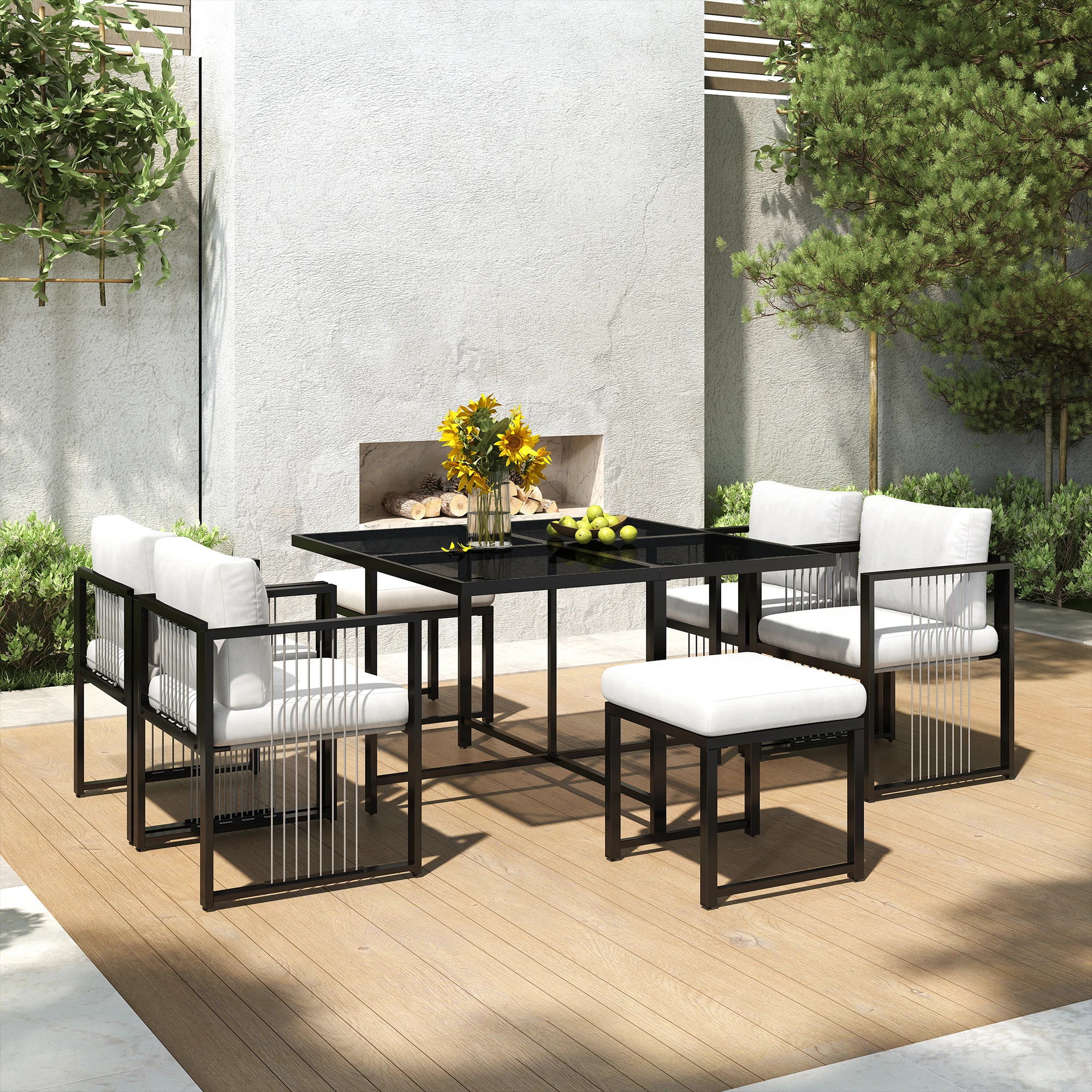 1. Spacious and Comfortable: This set includes a square table (117×117 cm), four chairs, and two footstools, comfortably accommodating up to six people, making it perfect for outdoor gatherings.