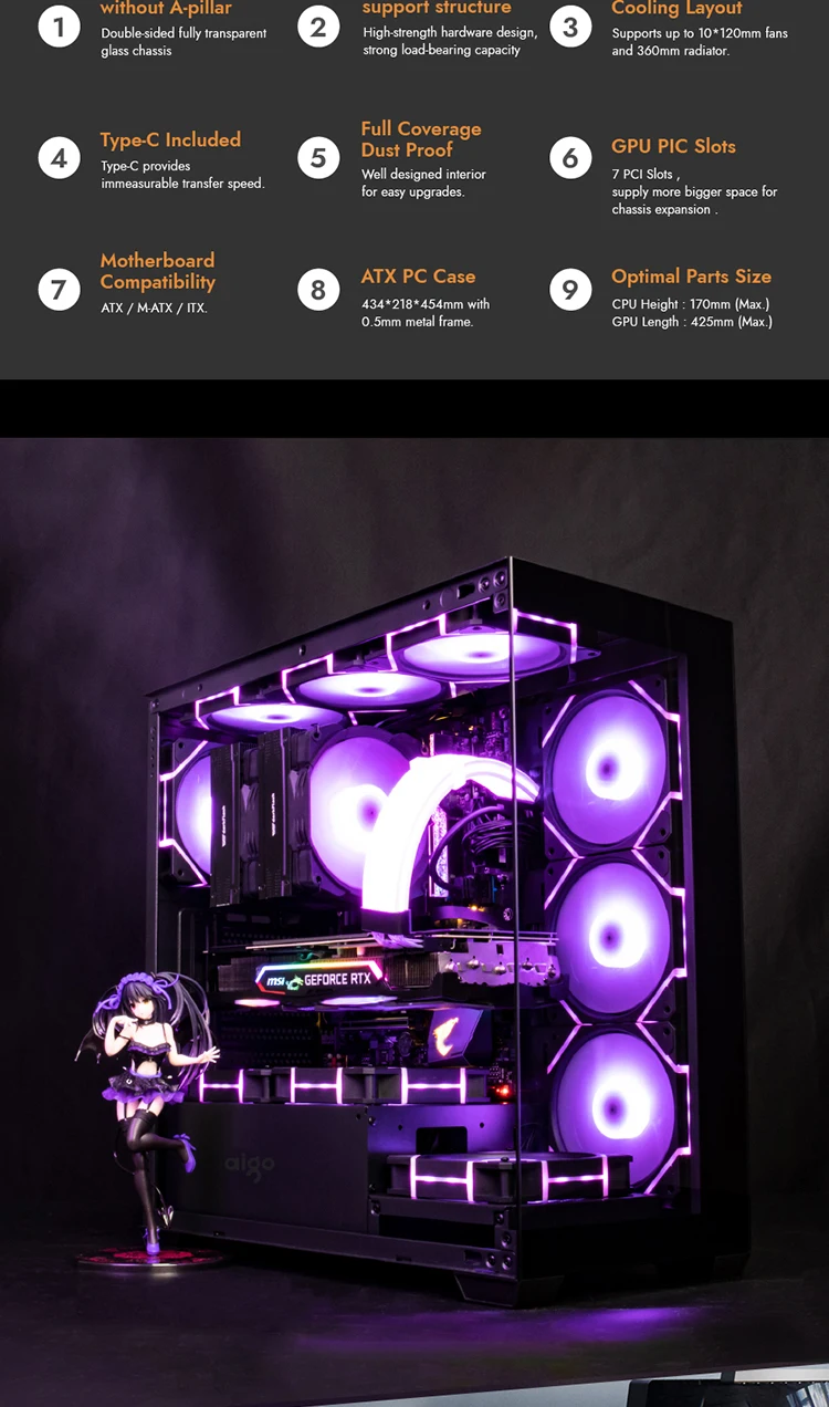 Aigo AS900 PC Case ATX M-ATX ITX Motherboard Gamer Cabinet Double-Sided Tempered Glass Desktop 270° Sea View Room Computer Case