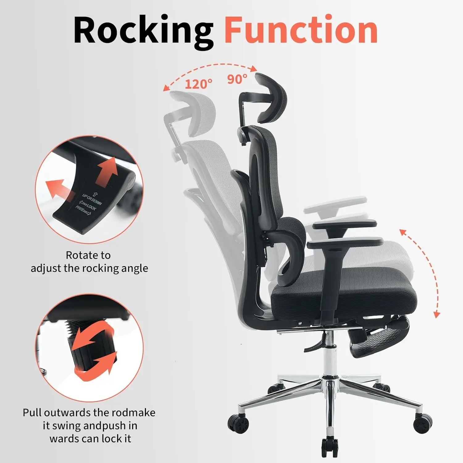3.Customizable Adjustments & Rocking Function: Adjust the rocking angle between 90°-120° and lock it in place; the 3-stage SGS-certified air rod allows smooth height adjustment, paired with 360° swivel casters for easy movement.