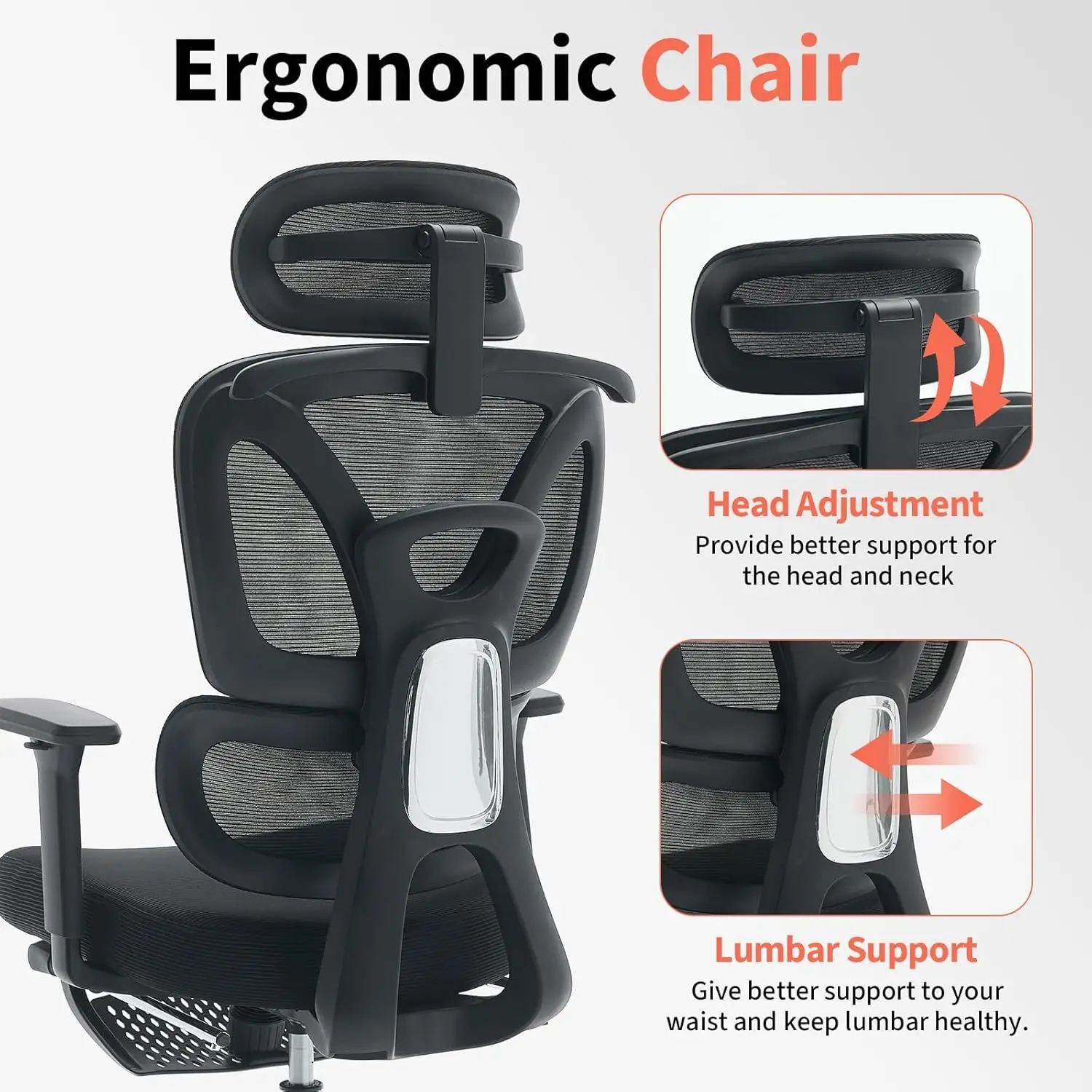 1.Ergonomic Design for All-Day Comfort: This high back mesh chair features adjustable headrest and dynamic lumbar support, perfectly aligning your spine to reduce neck, shoulder and lower back strain during long work hours.