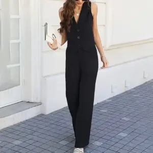 Featuring a V-neck and ankle-length pants, this set combines elegance with practicality, ideal for everyday wear.