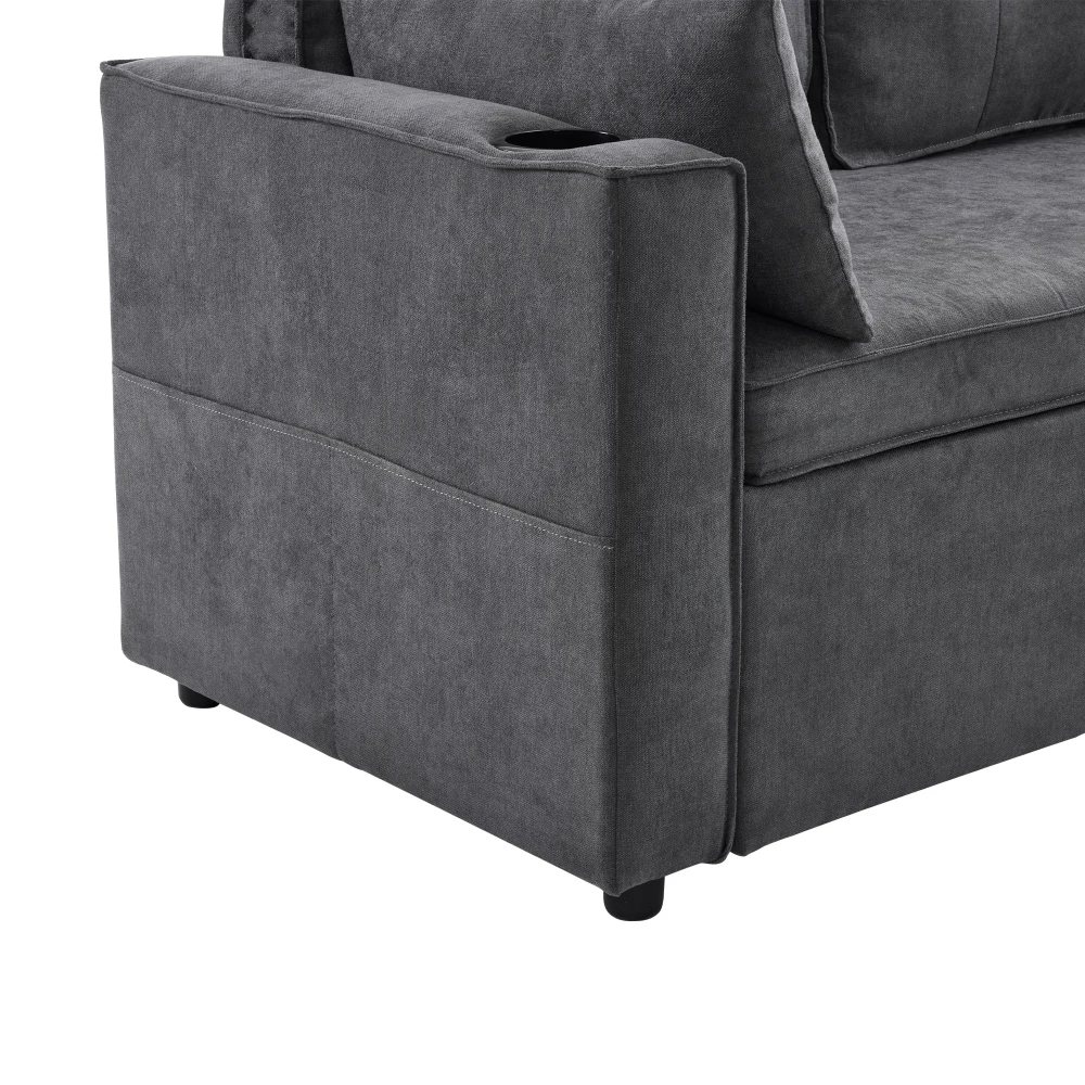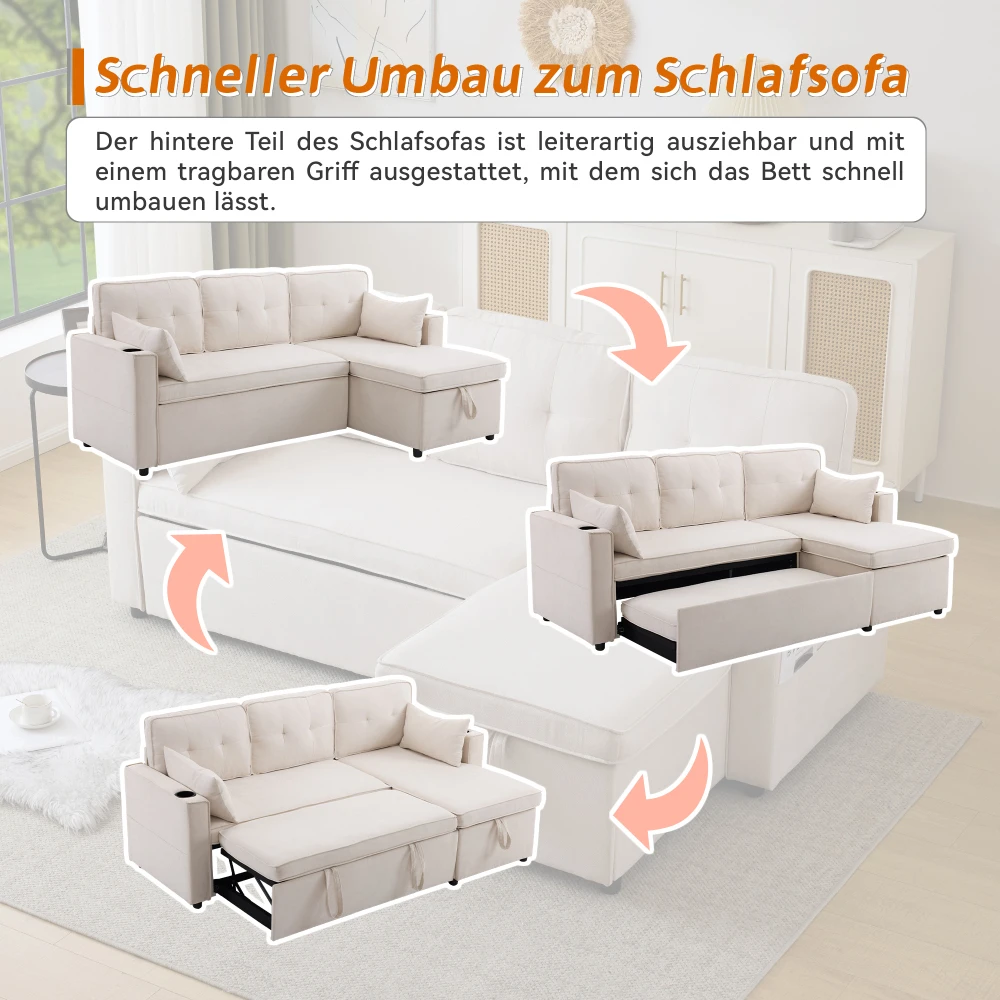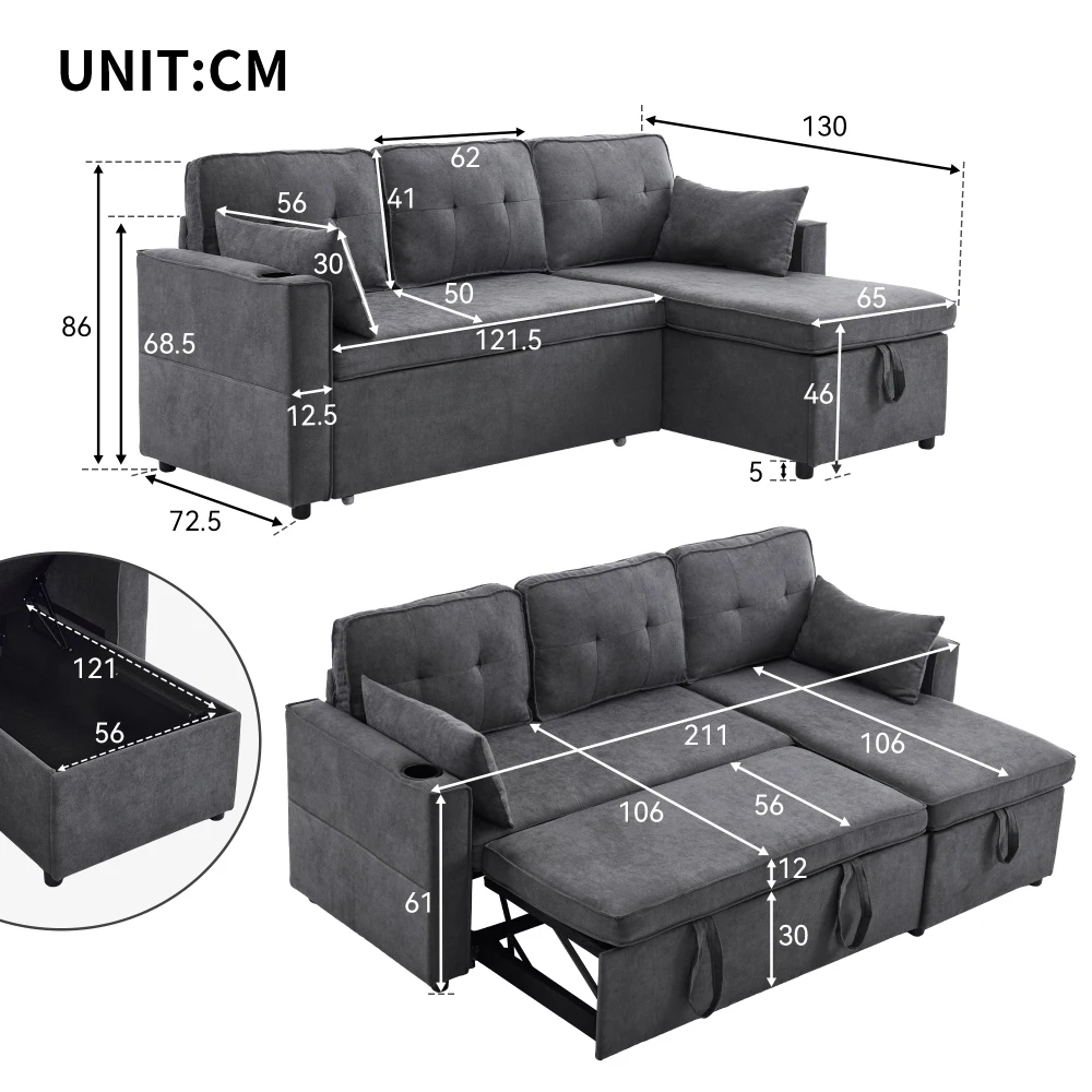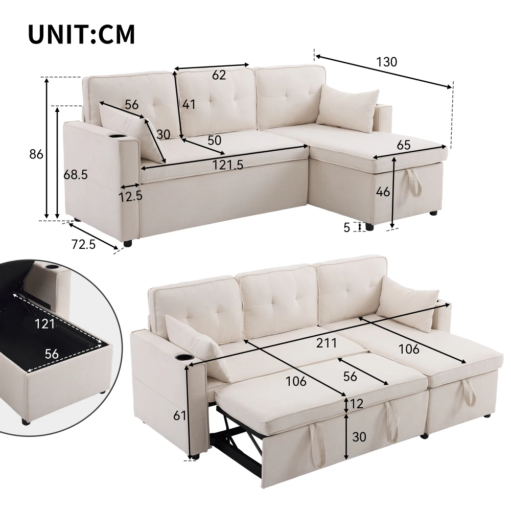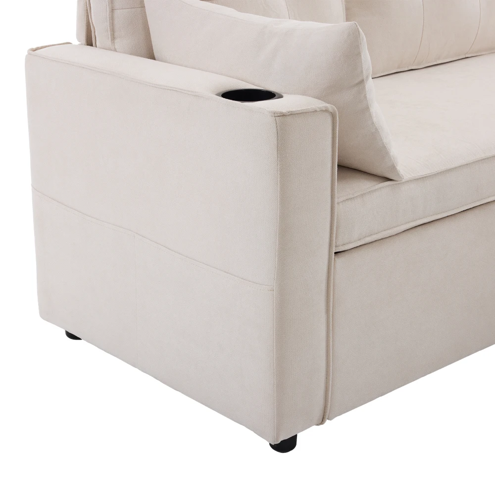 Folded out as a sofa bed, it measures 211 x 130 x 86 cm and offers additional space and comfort. The side pockets on both sides of the armrest are ideal for placing remotes, mobile phones and magazines, and the beverage holders on both sides are suitable for placing water bottles. In addition, the sofa is equipped with two decorative pillows for added comfort.