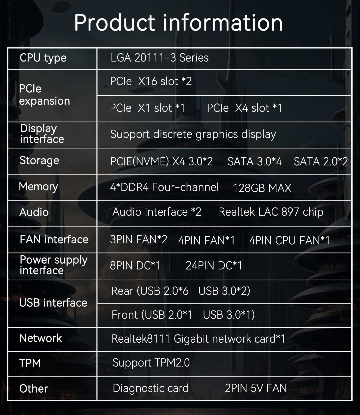 Interface: 1*RJ45/1*PS2/4*SATA2.0/2 *SATA3.0/6*USB2.0/2*USB3.0/2*PCI-E x16/1*PCI-E x1/1*PCI-E x4/1*NVME/NGFF M.2 interface;